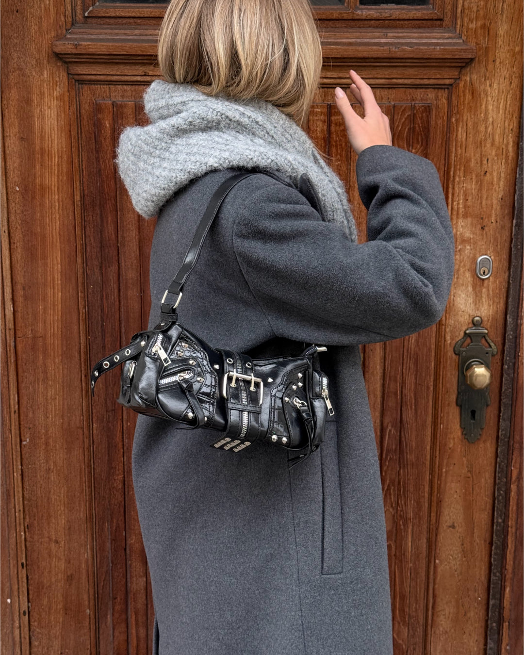 KALLIE taske, sort har den perfekte længde stropper, så man rent faktisk kan have den over skulderen. Tasken har blanke lynlås og nitter.