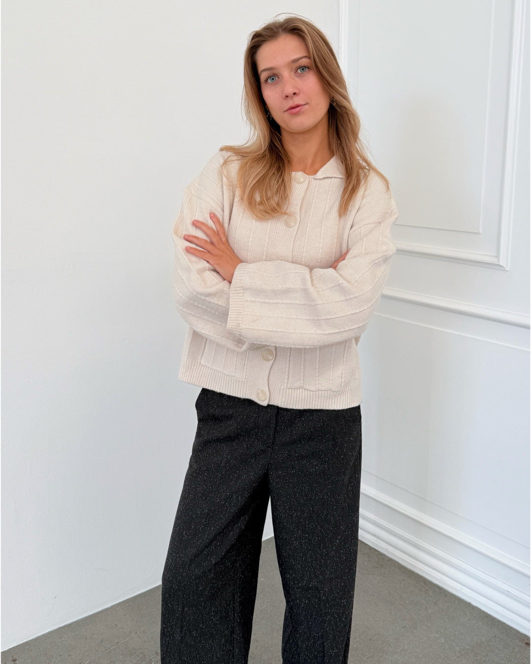 Vores LACEY cardigan, creme er en blød og dejlig cardigan. LACEY cardigan, creme er en smuk cardigan med fine detaljer. Cardiganen er designet med en lille krave samt knapper langs fronten og to lommer foran.