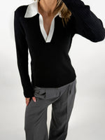 LIDYA polo bluse, sort har en hvid krave, som giver den et "old money" look.