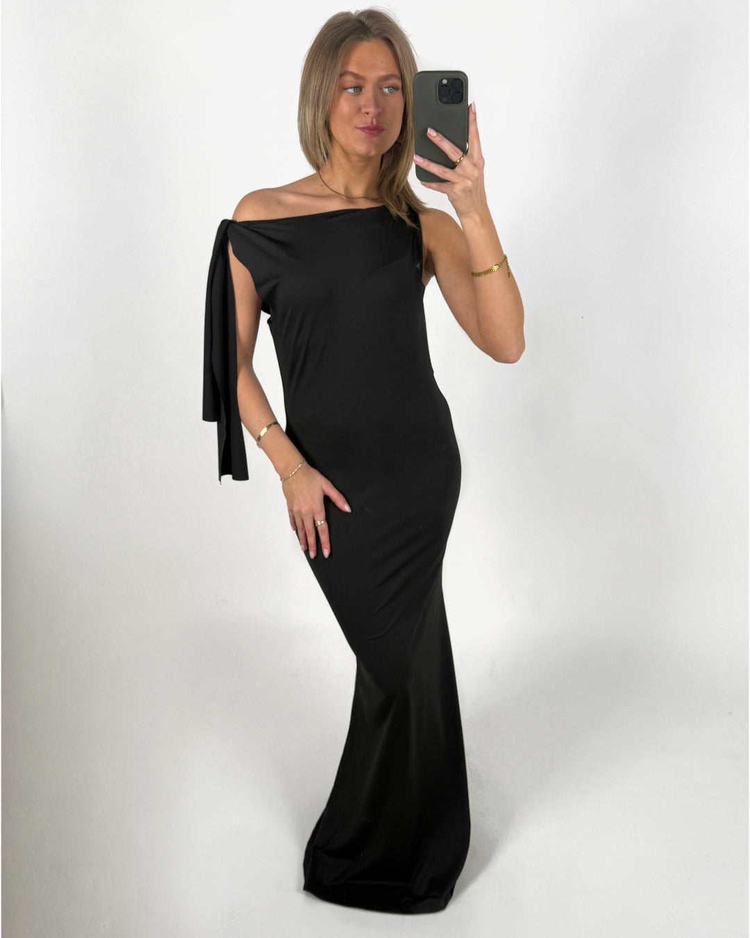 LILJA maxi kjole, sort har flere smukke detaljer som båd udskæring, rynkeeffekt og bindebånd ved skulder som pynt. De bare arme og skuldre giver et flot udtryk.