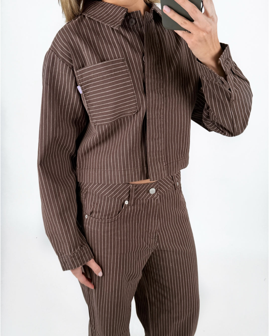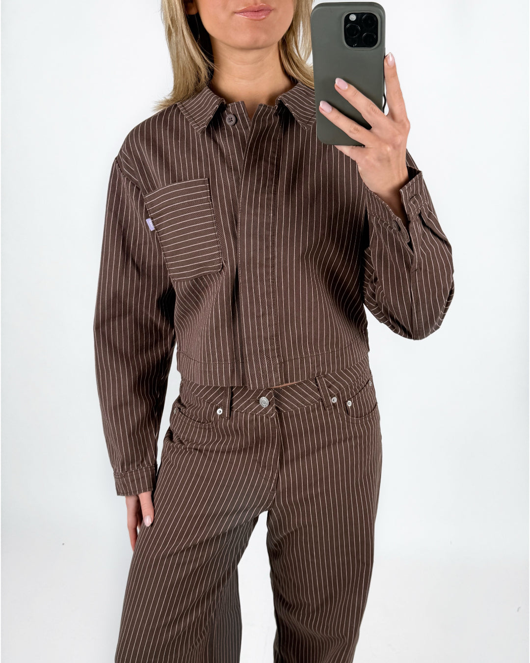 Vores MADDY jakke, brun/lyserød er med lyserød stribe og i det lækreste slidstærke materiale. MADDY jakke, brun/lyserød er designet med en skjortekrave, lange ærmer og en enkelt brystlomme på siden. Jakken kan bådes bruges som en skjorte eller jakke.