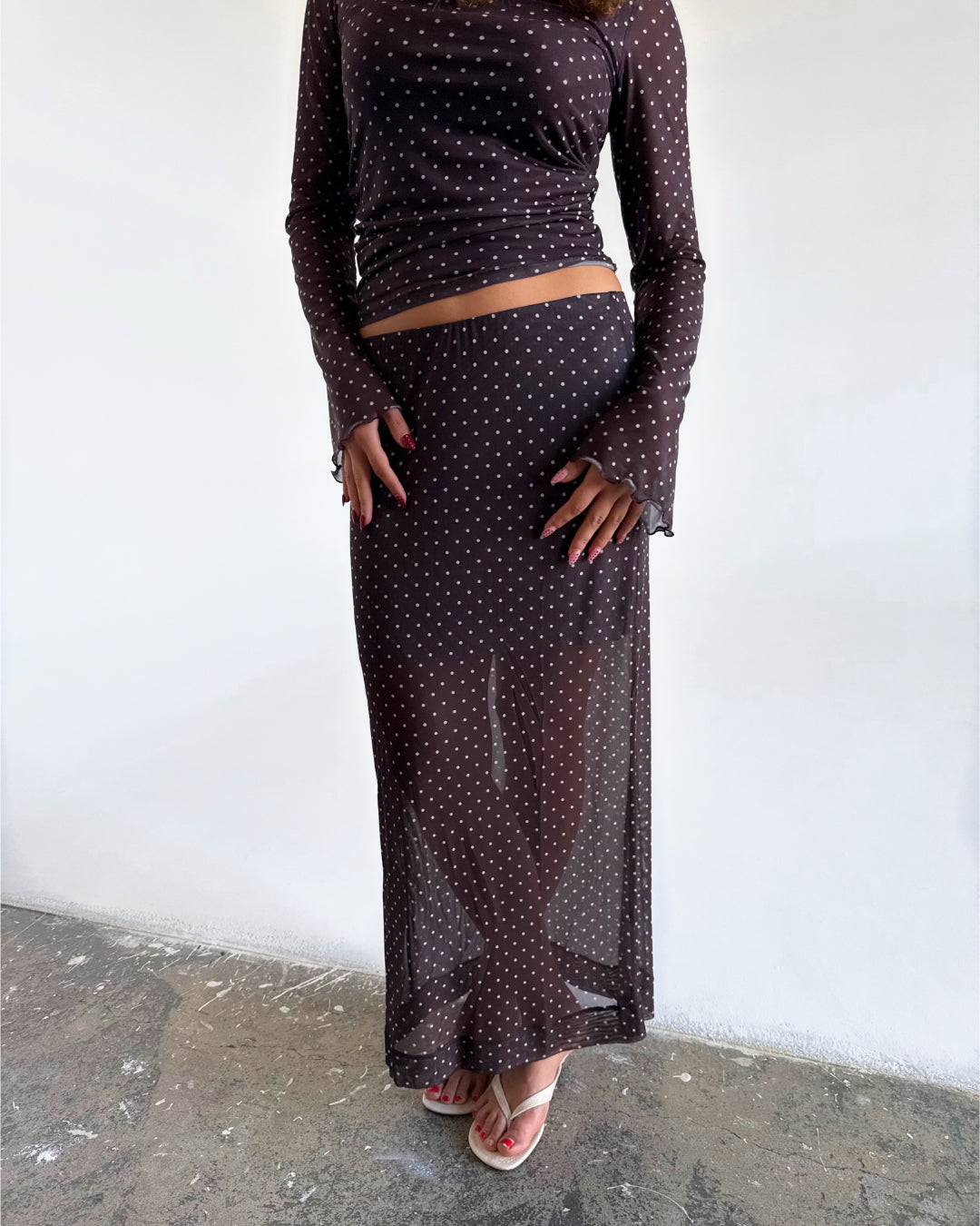 Vores smukkeste MINNA nederdel, brun er i et let mesh, strækbart materiale. Nederdelen er en maxinederdel, som kan styles med matchene overdel, for at udgør et fedt sæt. MINNA nederdel, brun er perfekt til alle årstider.