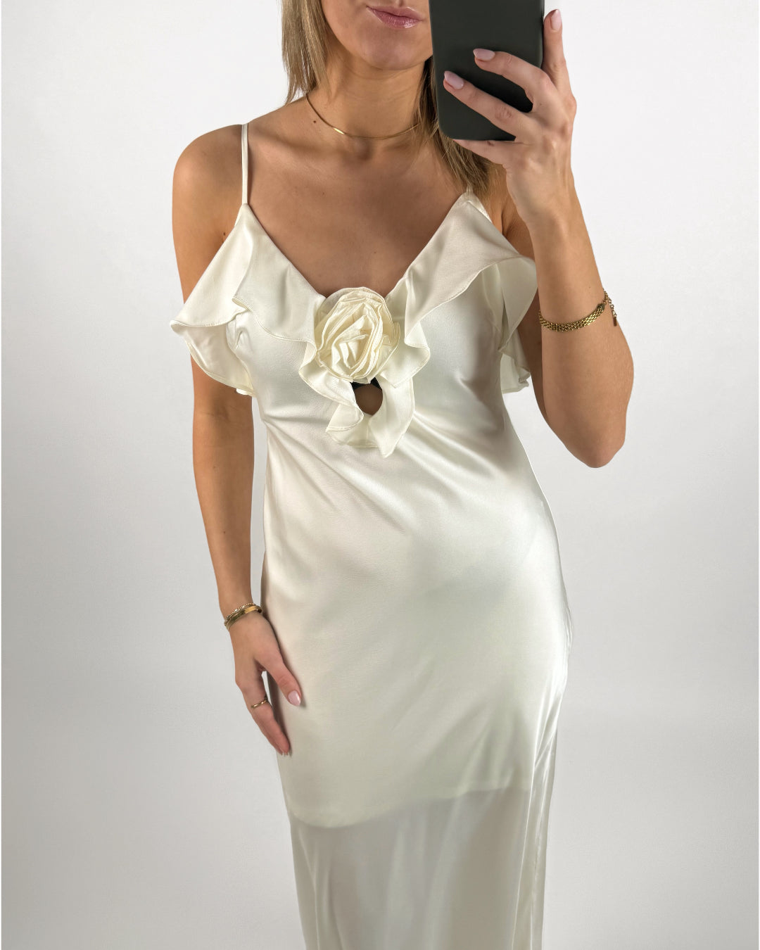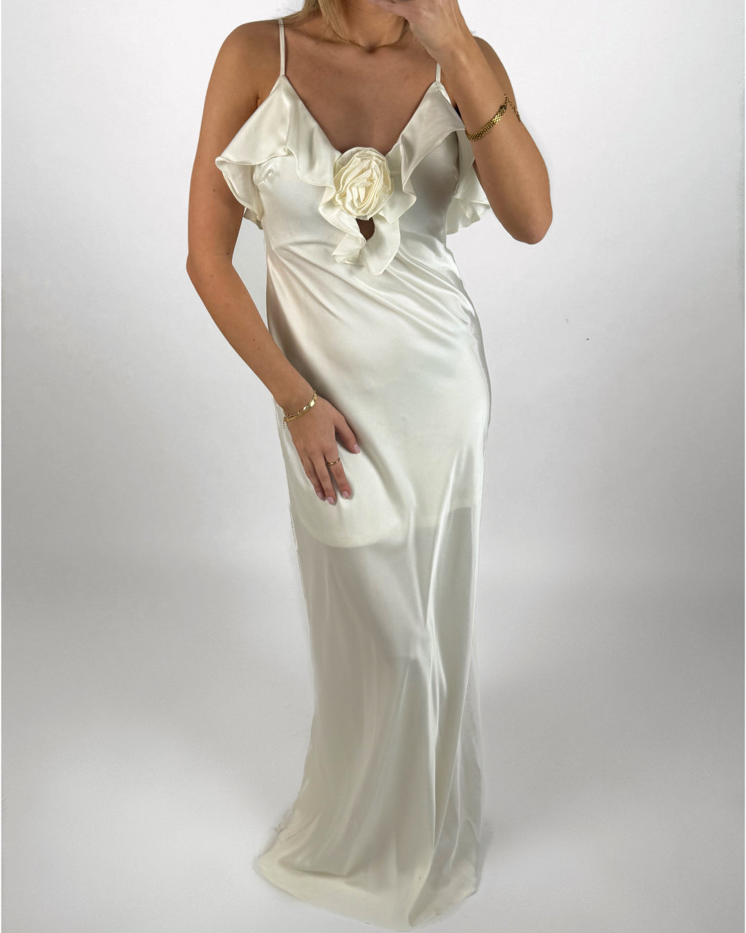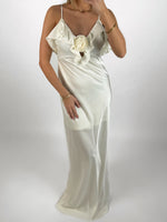 NICOLA maxi kjole, creme har mange smukke detaljer som tynde skulderstropper og flot udskæring med blomsterdetalje som pynt. De bare arme og skuldre giver et flot udtryk. Kjolen er en elegant maxi kjole i satin lignende stof. Kjolen er en lang, sidder smukt på brystet og falder smukt, grundet det løse stof.