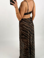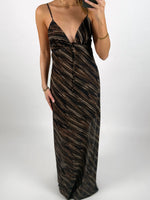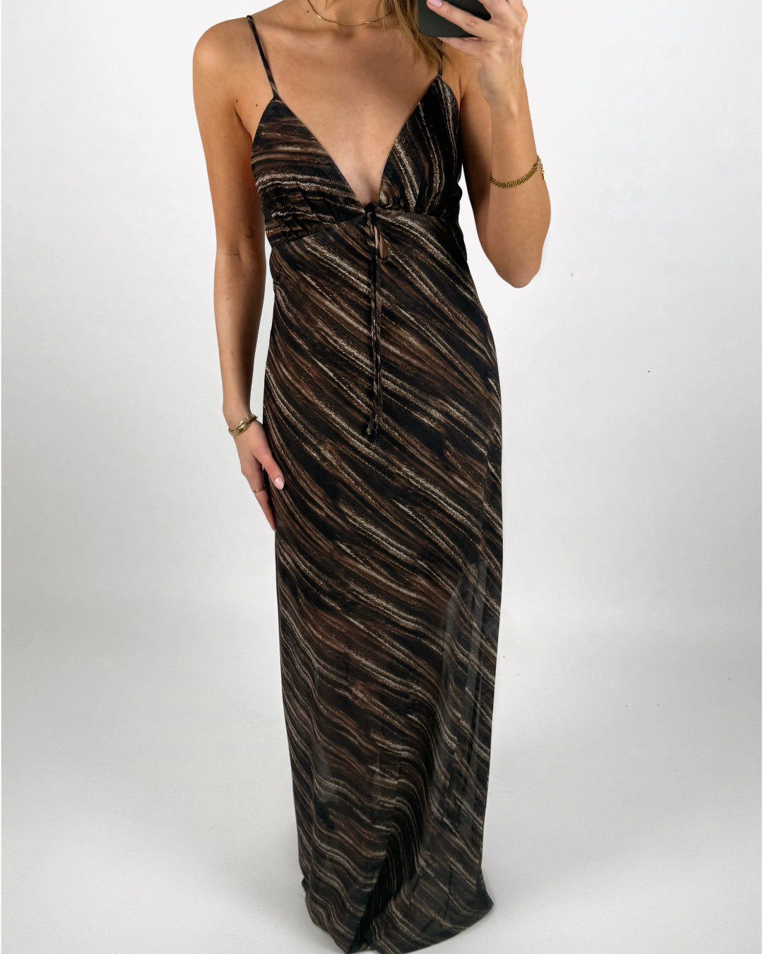 Den smukke SAHAR kjole, brun er en elegant maxi kjole i mesh stof. Kjolen har en flot dyb udskæring og en detalje med bindebånd ved brystet. Ryggen er flot åben.