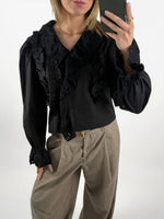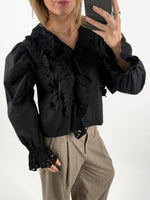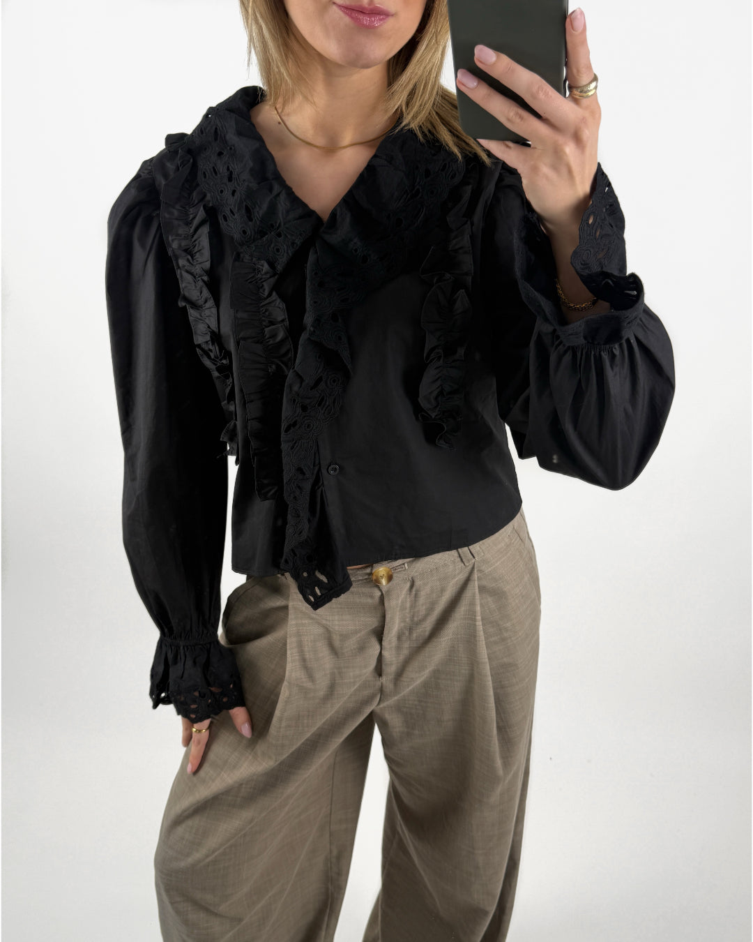 SALEM flæsebluse, sort har knapper foran som lukning, skjult bag flæsen.