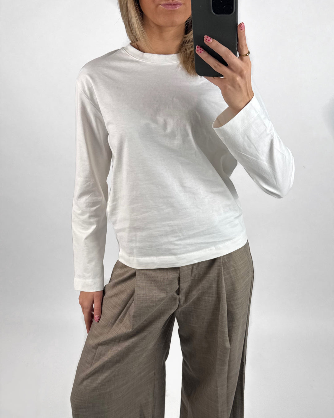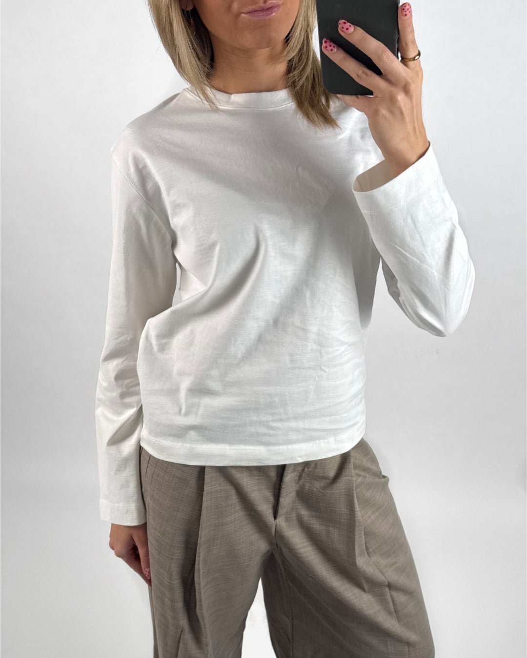 Den fede boxy SOPHIA long sleeve t-shirt, hvid er den perfekte basis i garderoben. Trøjen er i et "stift" bomulds materiale, hvilket gør at den sidder så cool.