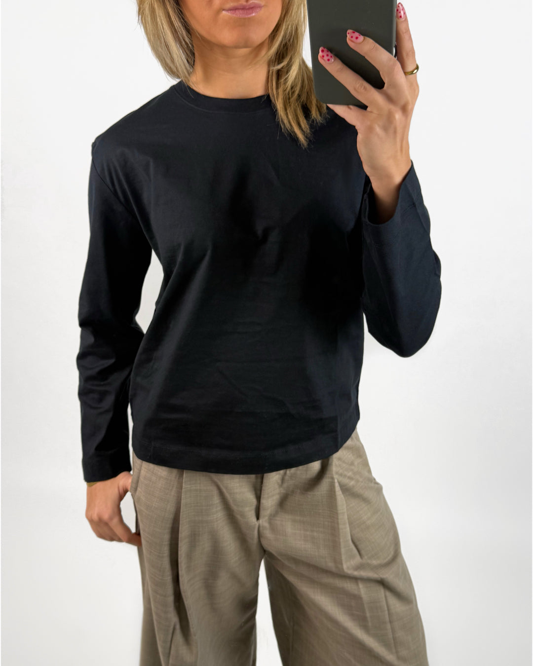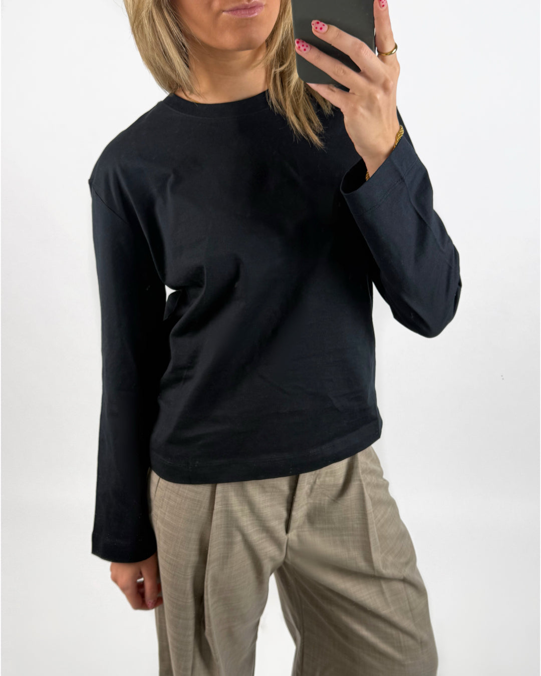 Den fede boxy SOPHIA long sleeve t-shirt, sort er den perfekte basis i garderoben. Trøjen er i et "stift" bomulds materiale, hvilket gør at den sidder så cool.