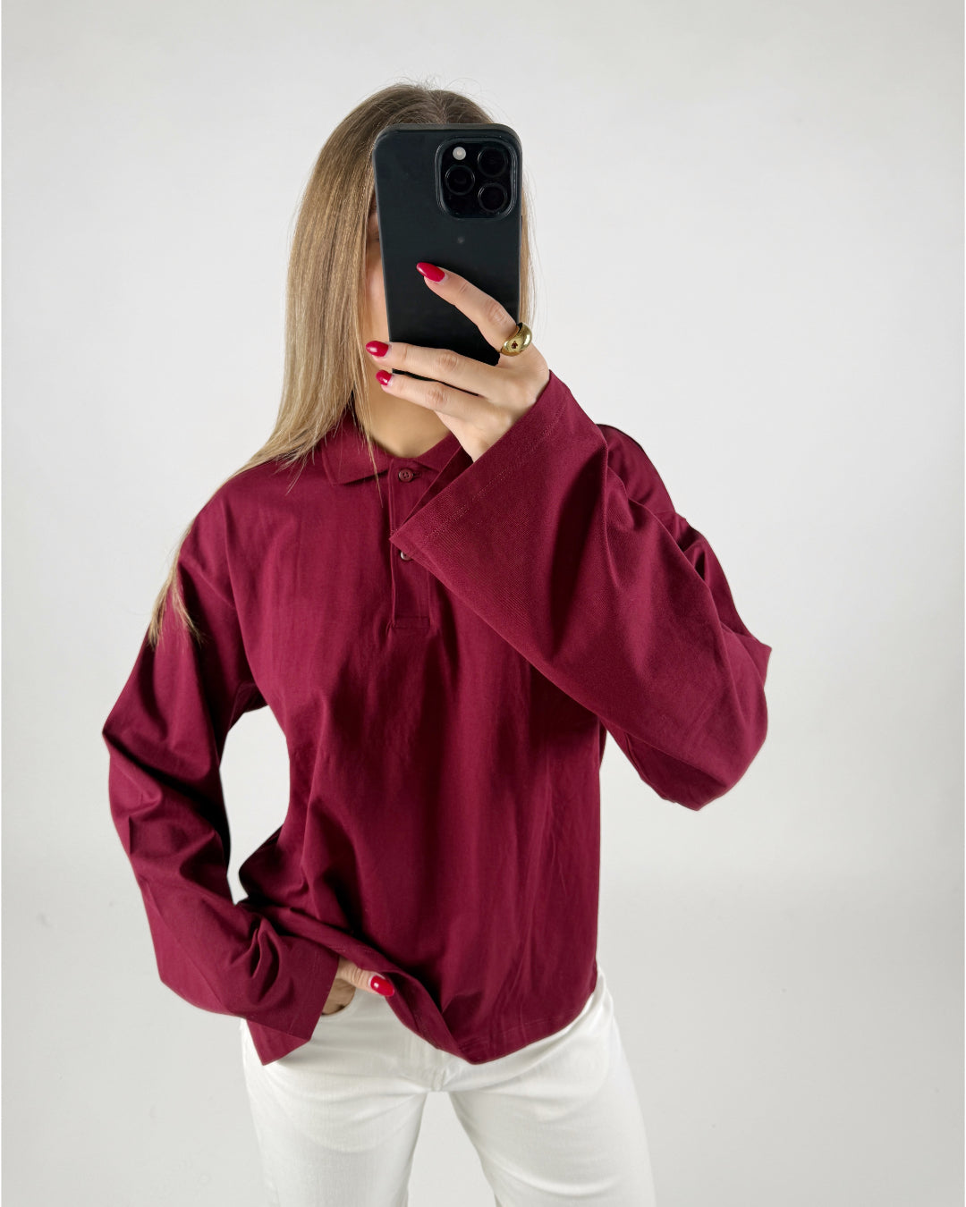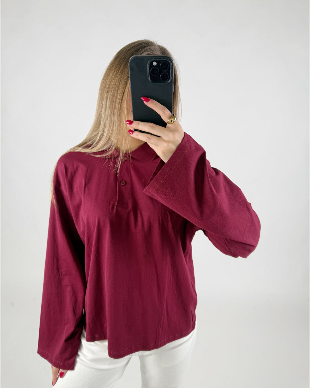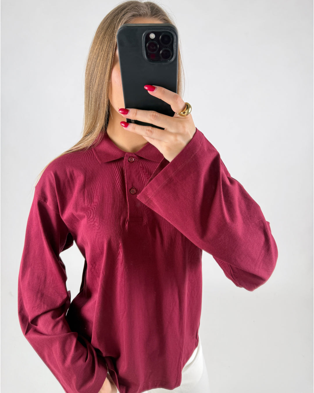 Vores VILMA polo, bordeaux er en langærmet polo, som har det sejeste look. VILMA polo, vinrød kan styles med alt fra din garderobe, da det er en basic overdel som kan bruges til mange forskellige anledninger.