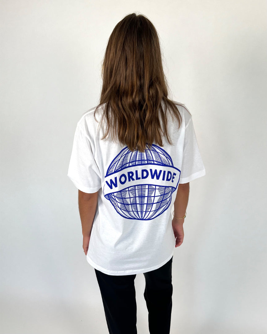 En person iført en hvid t-shirt med et blåt globusmotiv og teksten "WORLDWIDE" står med ryggen til kameraet i et neutralt, lyst rum.