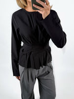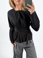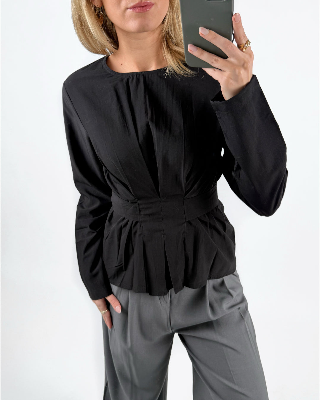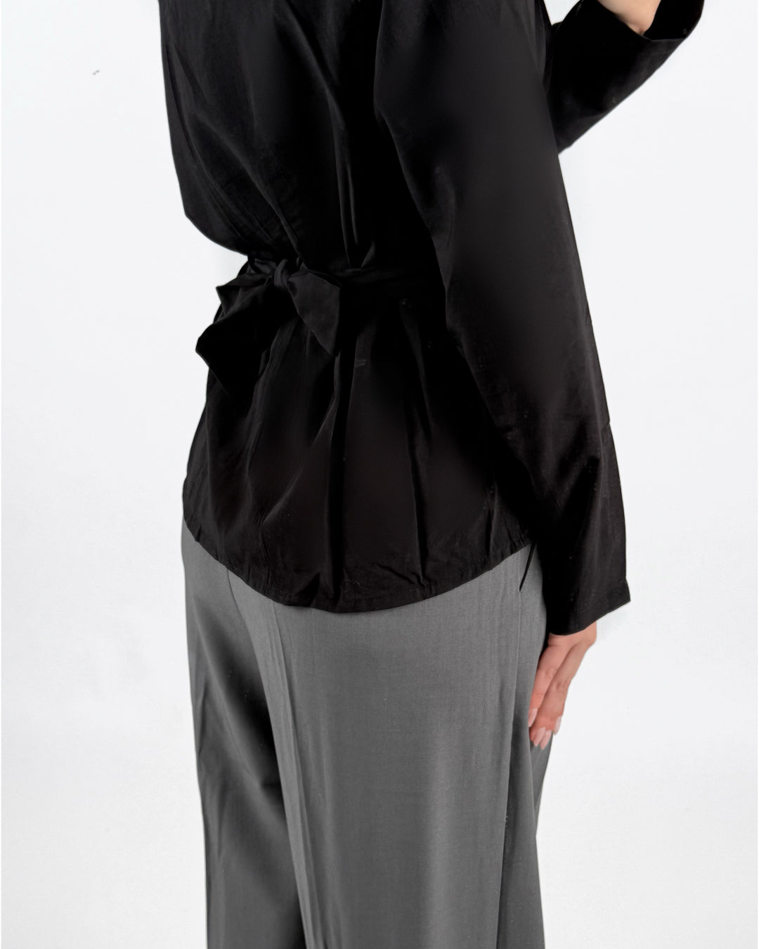 Vores virkelig smukke YUI bluse, sort er så fin og enkelt, dog med en virkelig flot detalje med bindebånd på forsiden. Detaljen giver skjorten figursyet udtryk og viser en fin talje. Skjorten har rund hals og har lukkes med en enkelt lille knap i nakken.