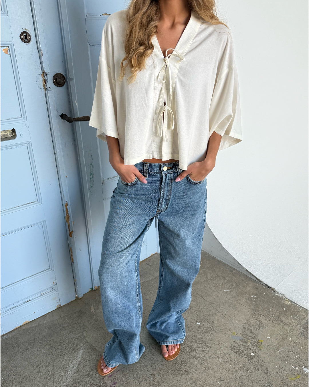 Modelfoto af pige i sort Zoya blondebluse og grå Nanna jeans. Alt er fra BySofieSønderby