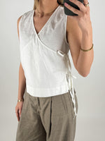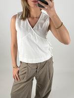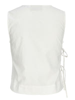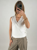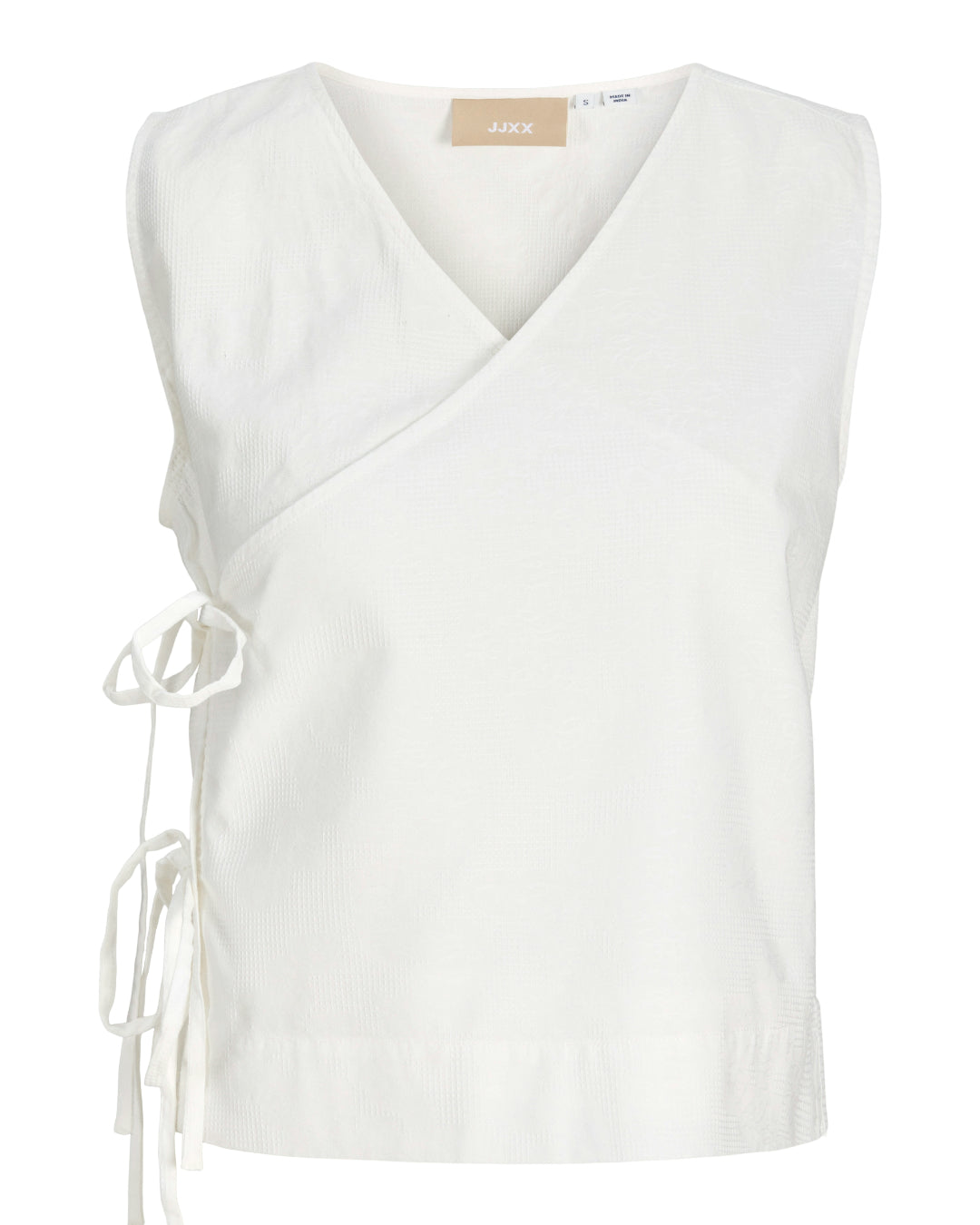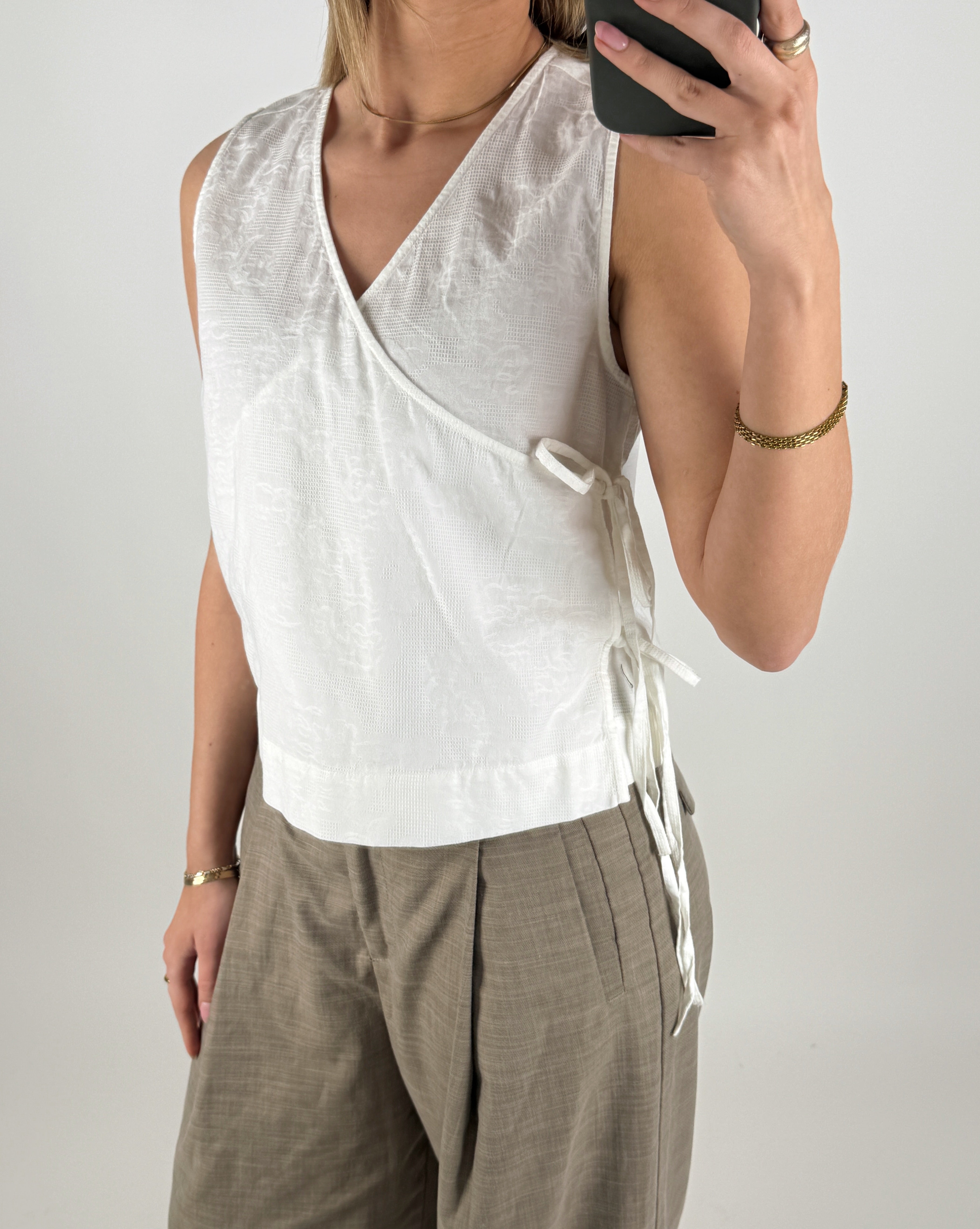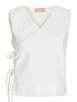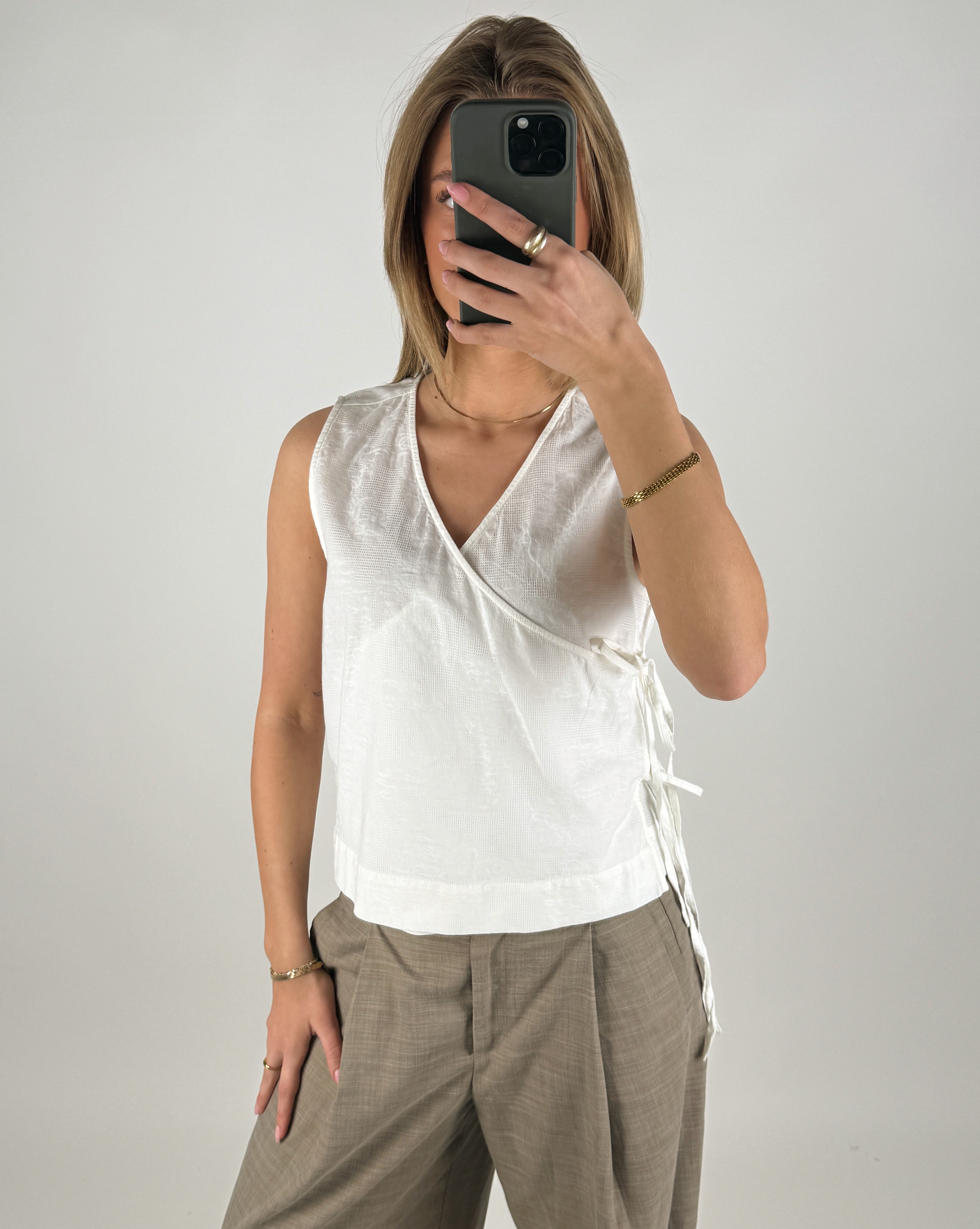 ALIA topp med bindebånd, vit är ett stilrent val som samlar enkelhet och feminina detaljer. Toppen är ärmlös och har en fin v-ringning som bildas av en elegant omslagsdesign. Omslagseffekten knyts i sidan med justerbara band, vilket gör det möjligt att anpassa passformen till precis din figur och samtidigt tillför ett vackert och exklusivt utseende.