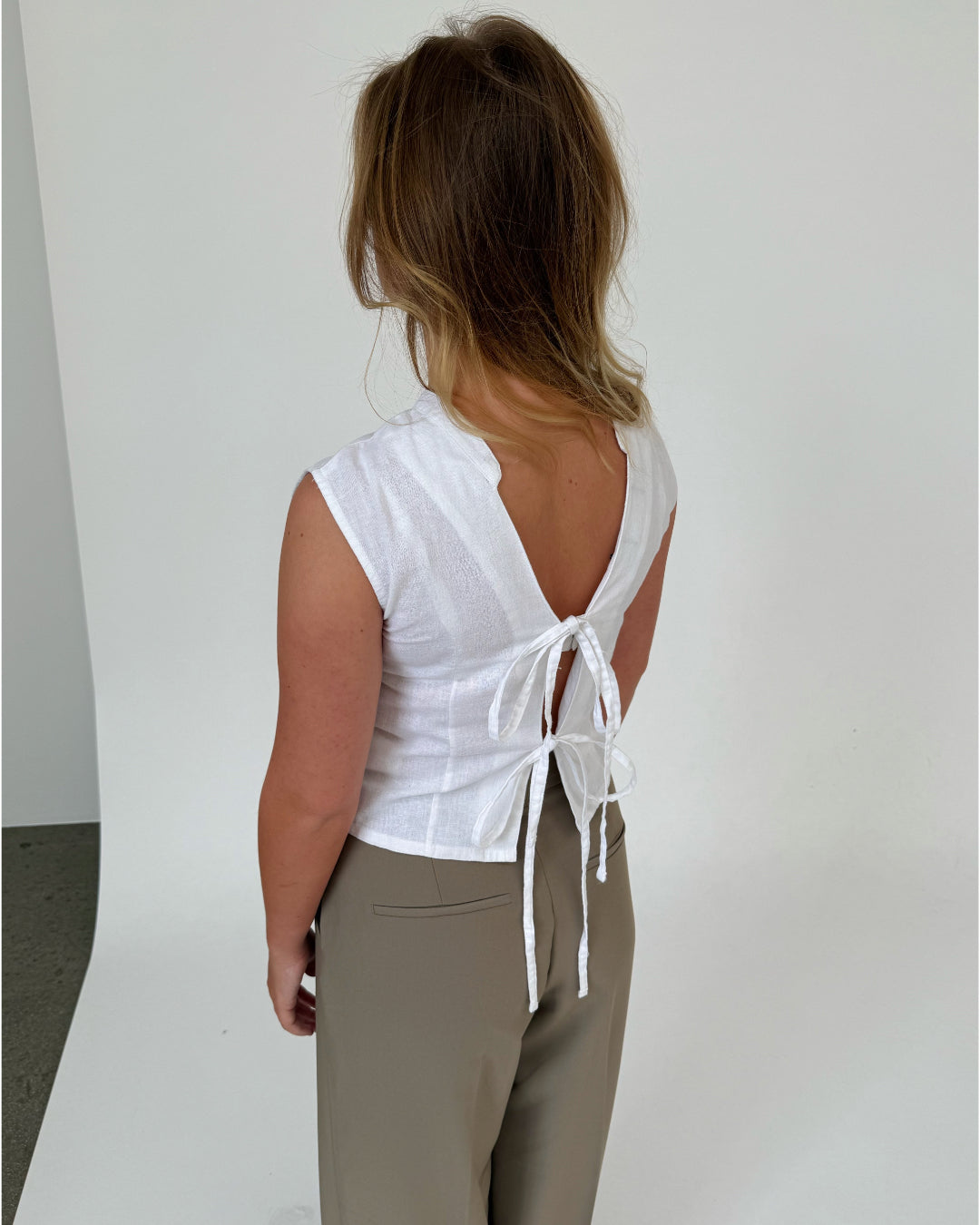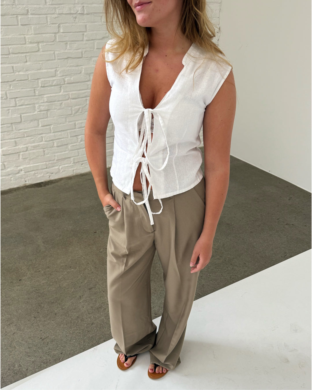 Den vackra ANNIKA toppen, vit är den perfekta toppen. Den är gjord i ett kraftigt linmaterial, vilket gör att toppen inte framstår som genomskinlig.