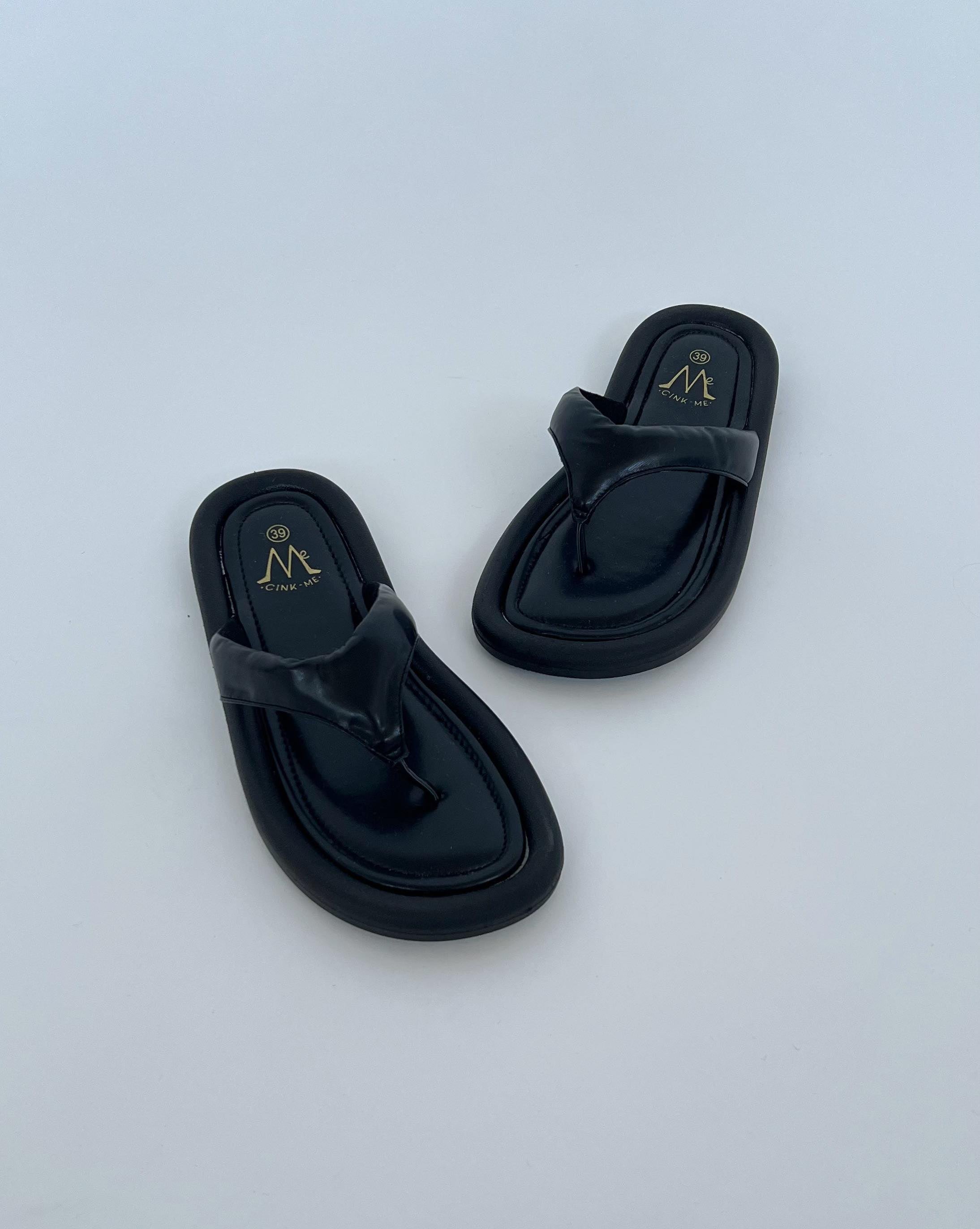 Sorte sandaler ligger på en hvid overflade. Teksten "39" og "CINK ME" er trykt i guld på indersålen.