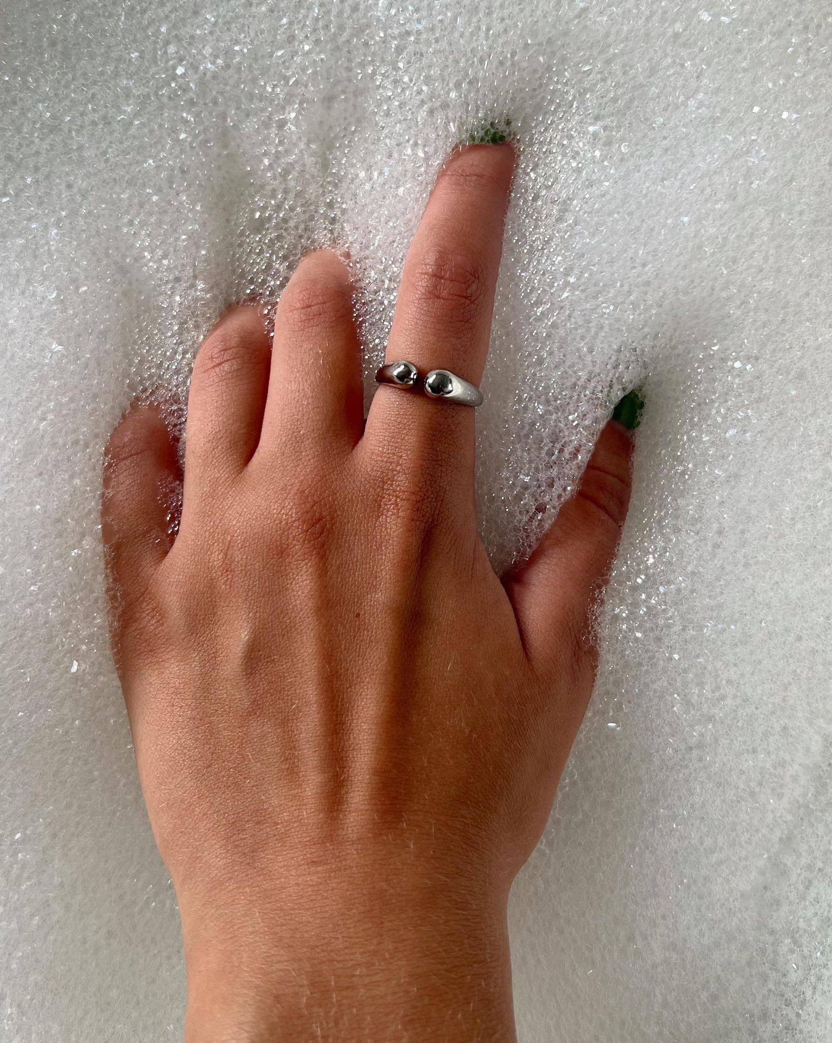 Hånd med sølvring bevæger sig gennem hvidt skum i vand. Skummet er tæt og dækker dele af hånden. Neglene er malet grønne.