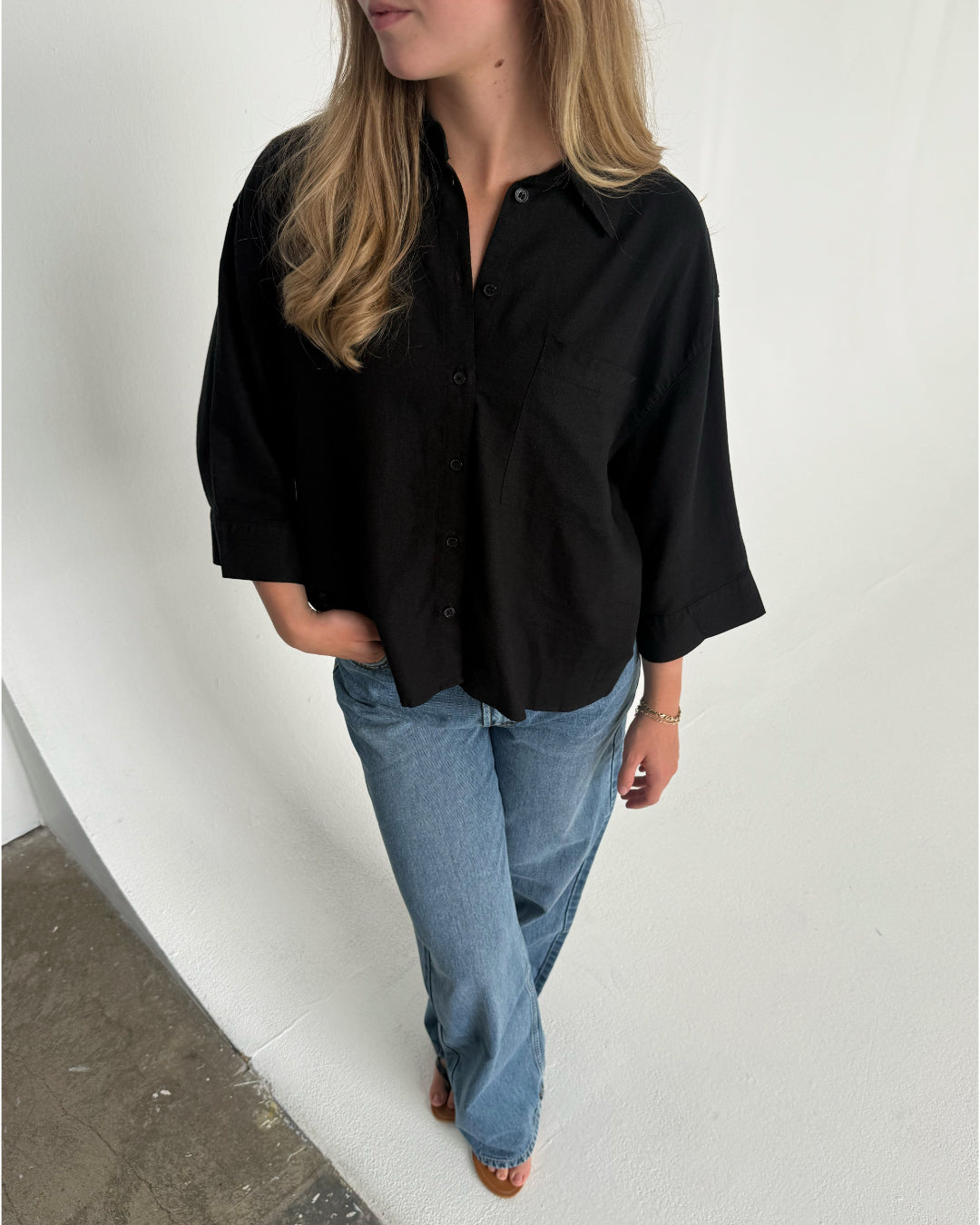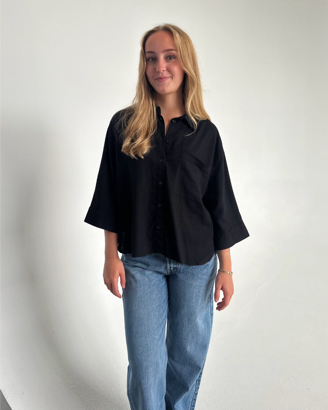 Den vackra BREEZE skjortan, svart är med 3/4 ärmar och med knappar fram som stängning. Har breda ärmar, och kan knäppas helt upp till halsen.