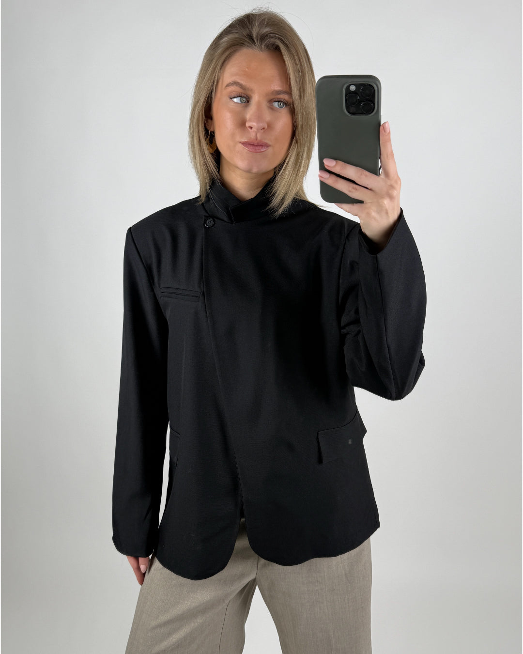 BRYNN blazer med hög krage, svart är ett elegant val till garderoben, som kombinerar klassisk stil med moderna detaljer. Blazern har en unik och tidlös kinakrage samt en asymmetrisk stängning med en enkel knapp högst upp, vilket ger ett minimalistiskt och exklusivt uttryck. Jackan är tillverkad i en lätt och mjuk kvalitet, som säkerställer god komfort och ett elegant fall. Designet erbjuder falska fickor, som tillför en formell touch.