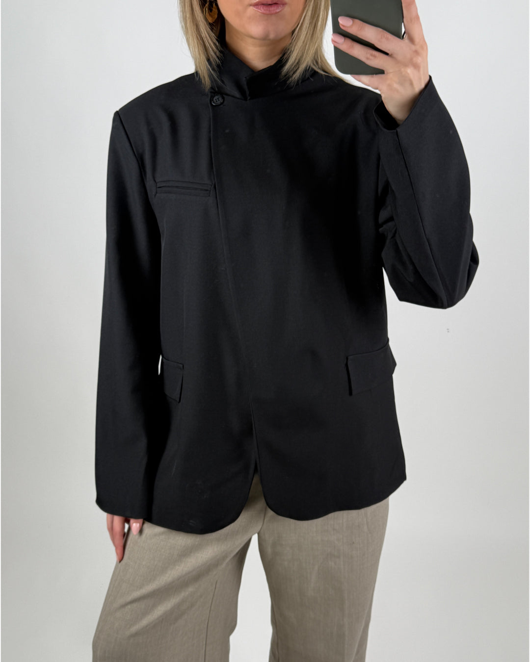 – Blazer med asymmetrisk knäppning.