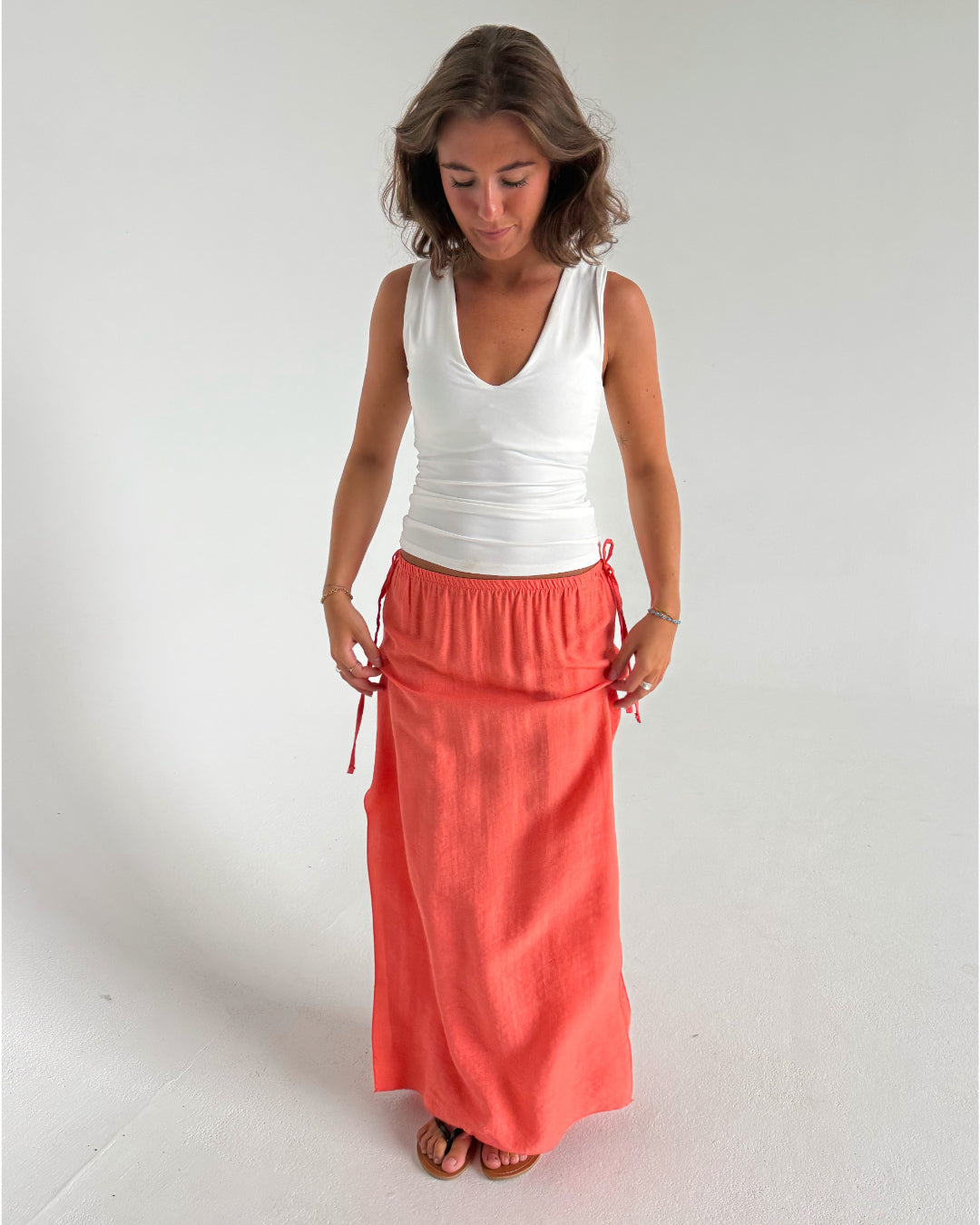 Modelfoto af pige som bærer en Daisy nederdel i coral, samt en hvid  Blakely top. Alt fra By Sofie Sønderby