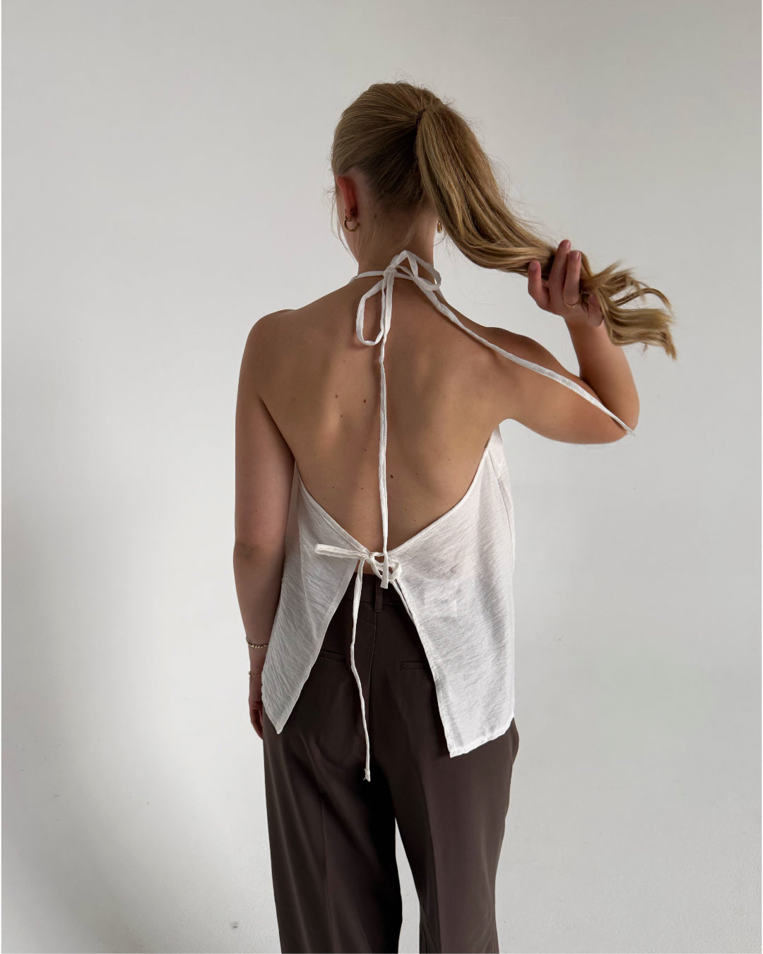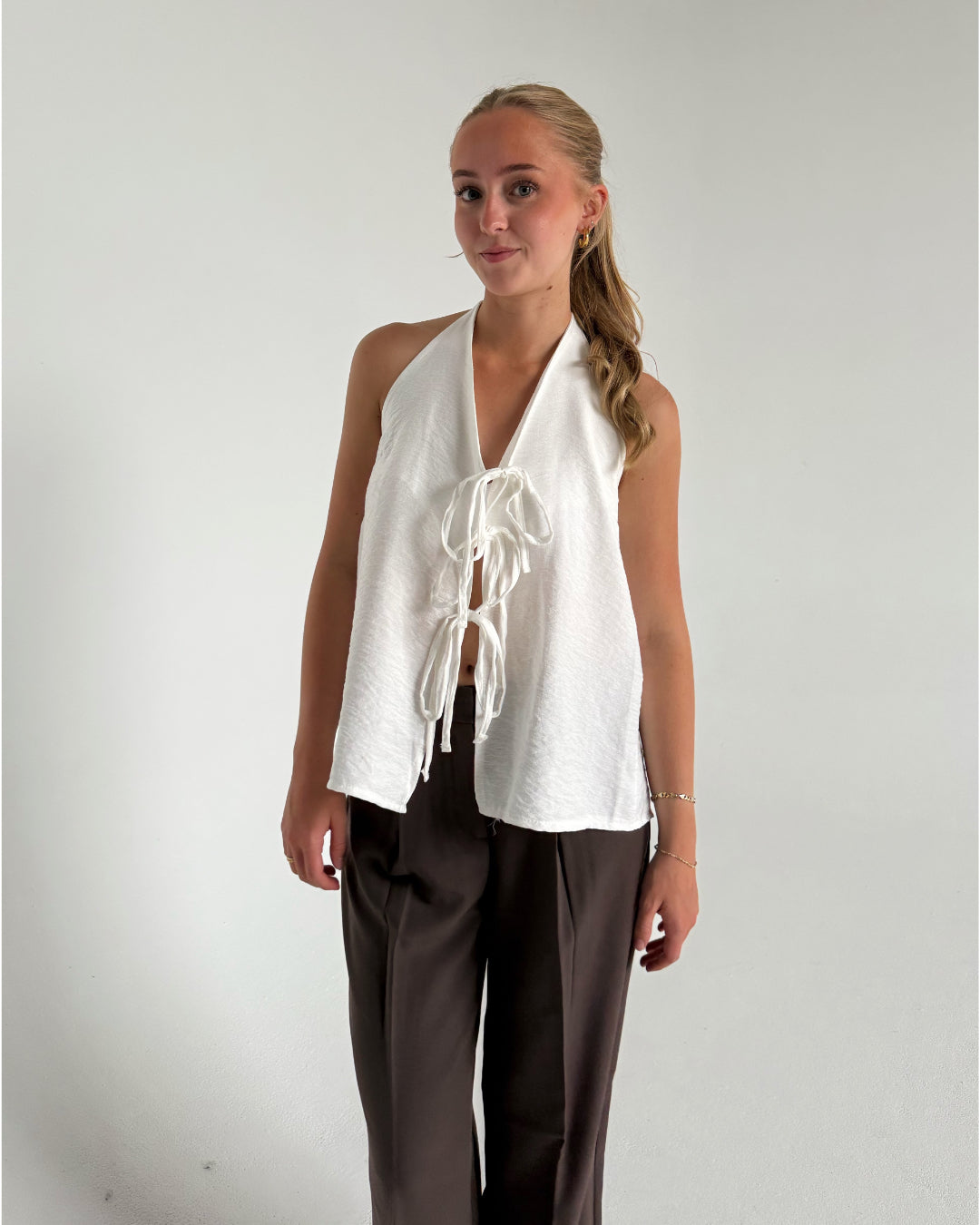 Toppen knyts både i nacken och på ryggen. Dessutom har den bindeband längs framsidan, som kan knytas till fina rosetter.