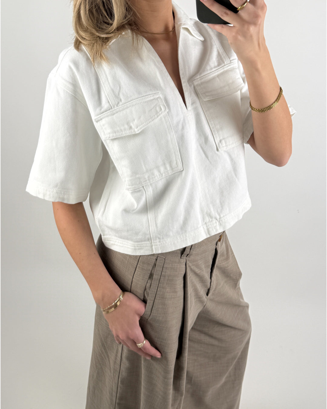 Den görs både i vit och klassisk blå denim, så du kan välja mellan en fräsch eller mer rå look. Använd den tillsammans med högmidjade jeans, shorts eller kjol för en modern, avslappnad outfit, perfekt för både vardag och fritid.