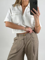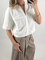 Trendig och cool DAYANA denimskjorta, vit med casual attityd. Modellen har korta ärmar, klassisk krage och två dekorativa bröstfickor, som ger ett rått och sportigt uttryck. Skjortan är lätt oversized och har en fin, boxy passform som sitter bekvämt och snyggt.