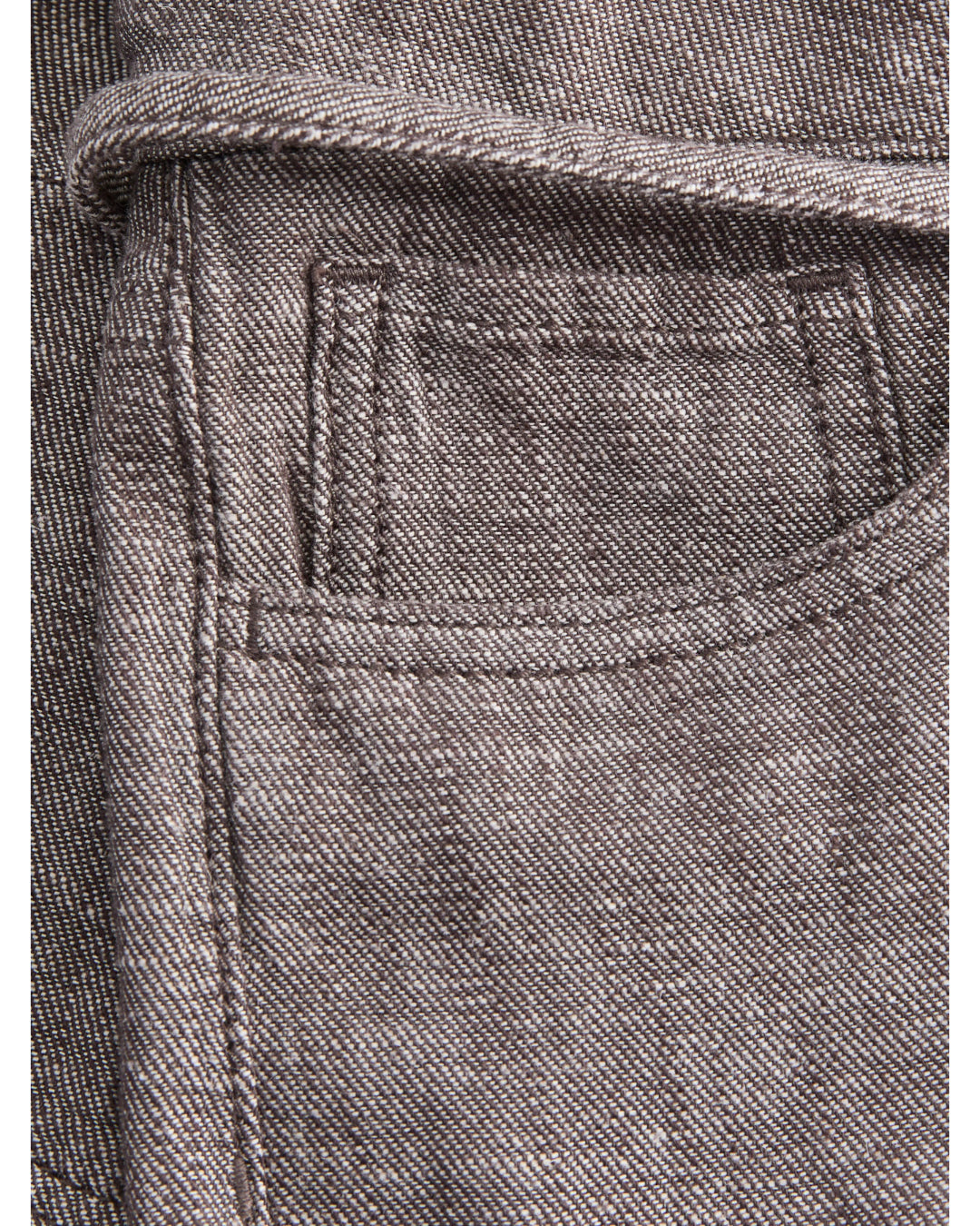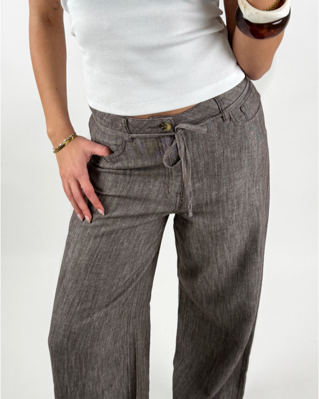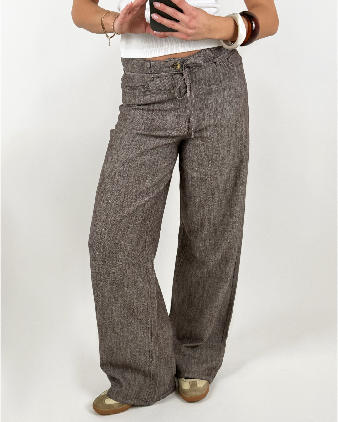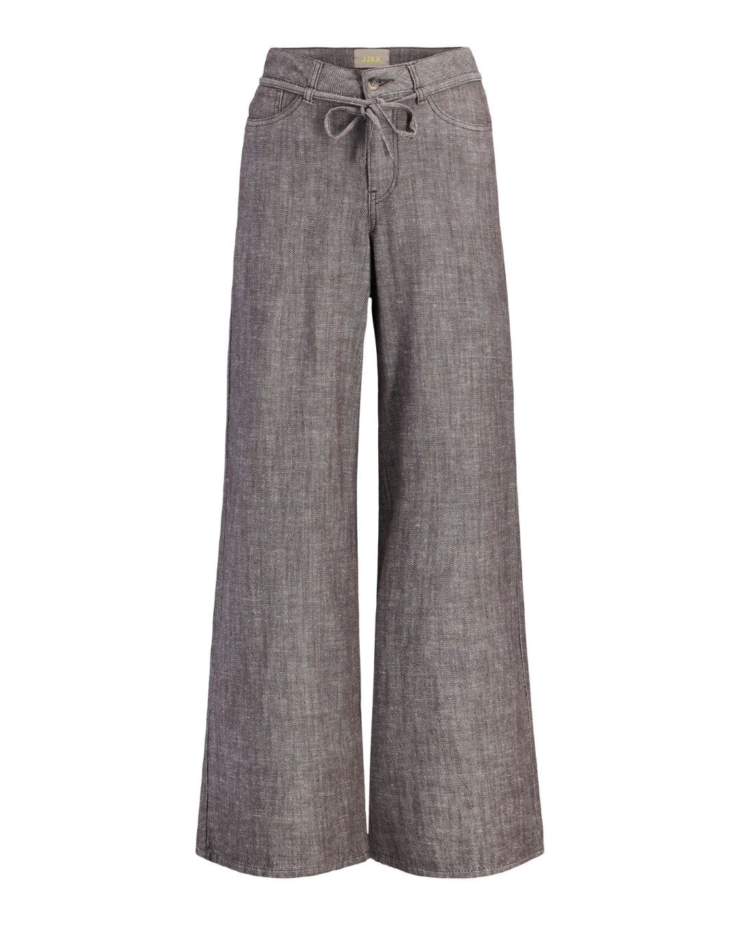 Modellen har en härlig, lös passform med vida ben och snörning i midjan, vilket ger en avslappnad och modern look. Byxorna har klassisk fickdesign samt knapp- och dragkedjestängning, vilket gör dem lätta att styla till både skjortor, t-shirts eller lätta stickade tröjor.