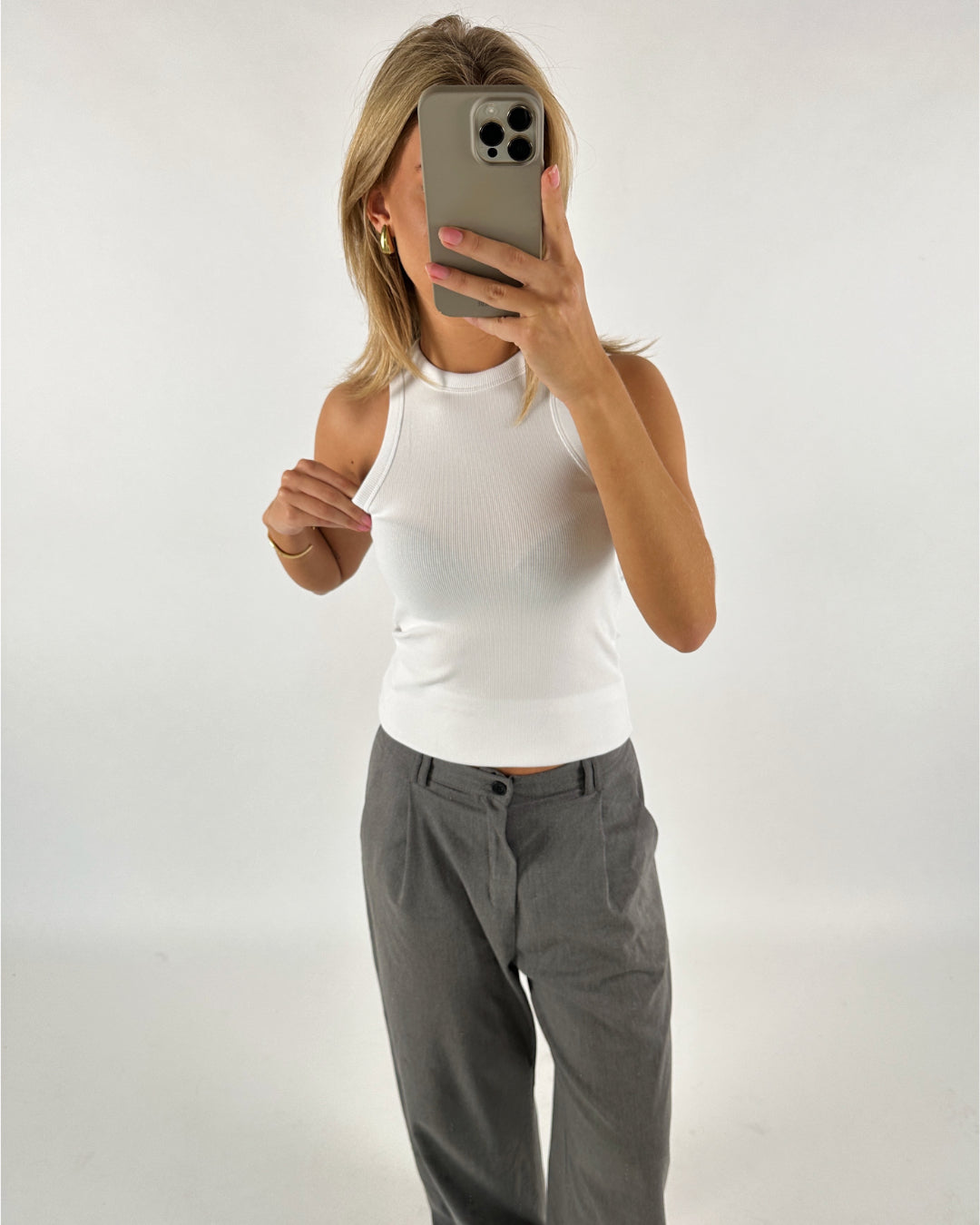 Hvid tanktop med ribbet struktur hænger stille. Overkriften på mærket indeni lyder: "JJXX". Omkringliggende miljø er en ensfarvet, hvid baggrund.