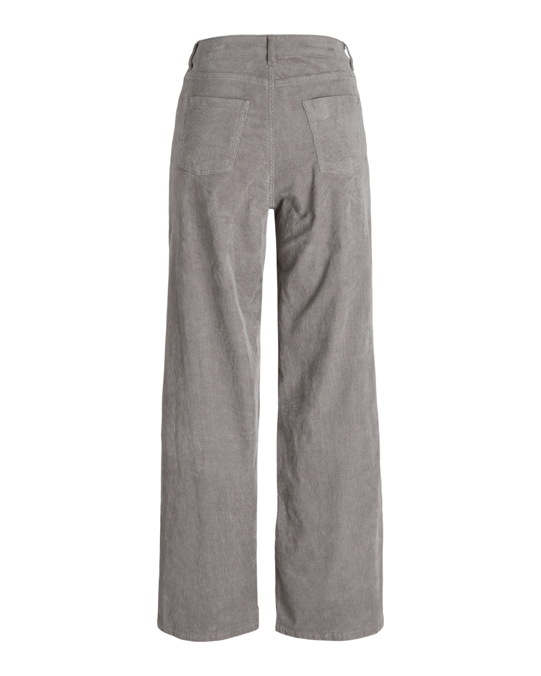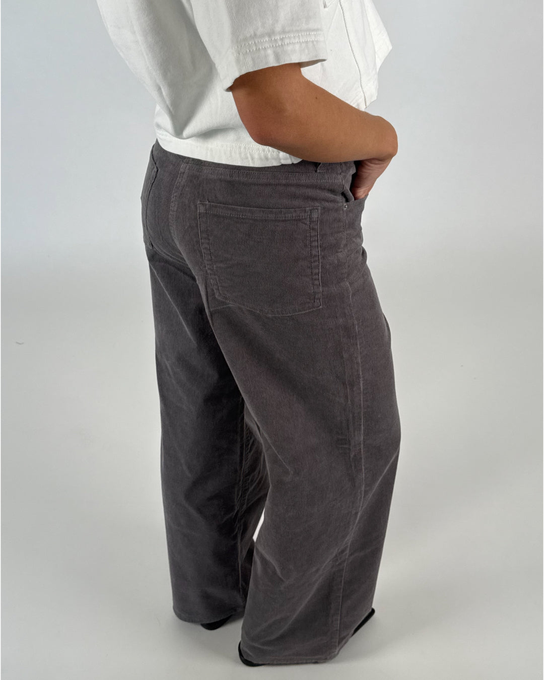Grå bukser med vide ben og lommer bagpå ses stående i en neutral indendørs setting. Bukserne har en fløjlsagtig tekstur.