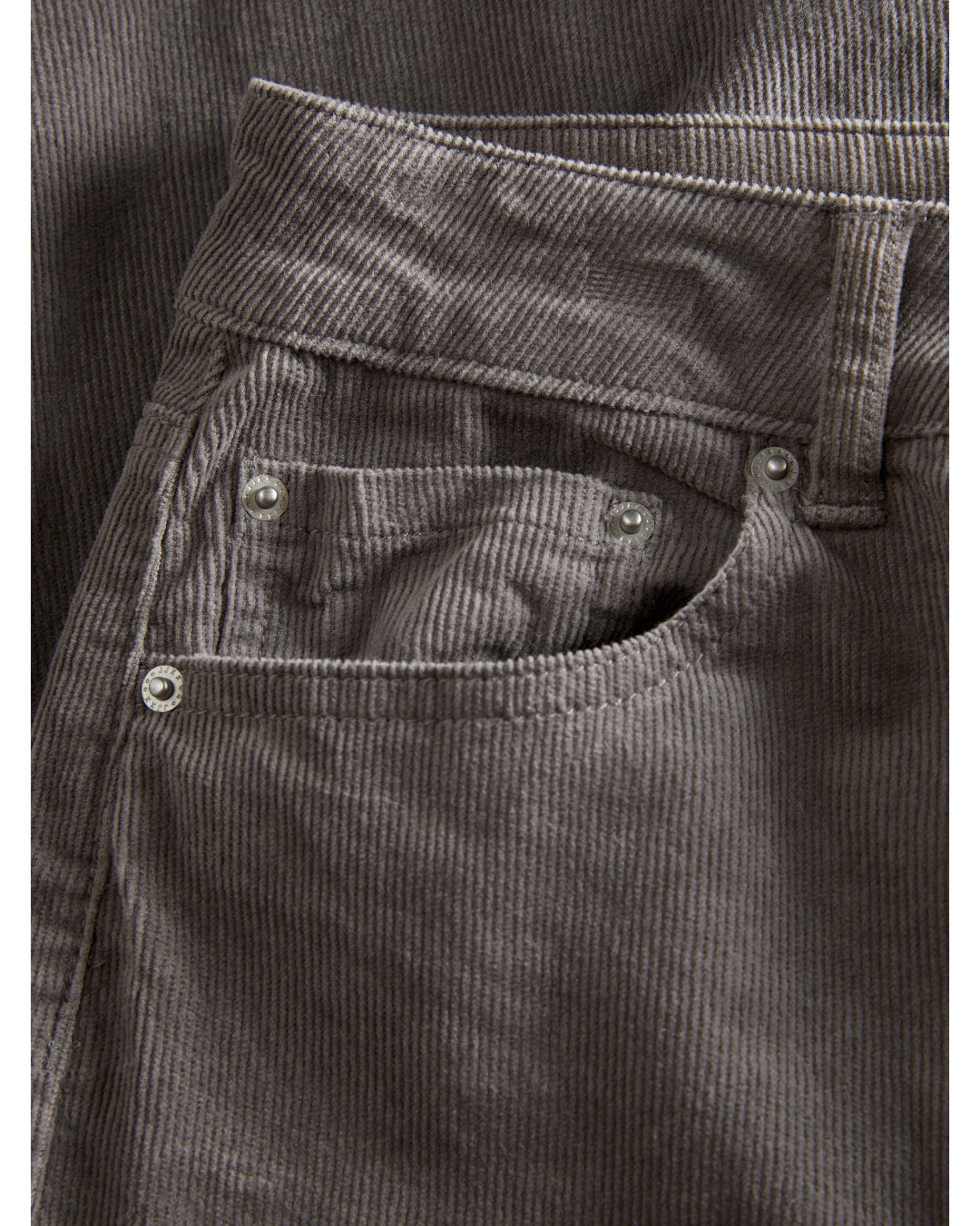 Brune fløjsbukser med fremtrædende lodrette ribbe, set fra tæt afstand. Sølvfarvede nitter pryder kanten af lommen, der er en del af buksernes enkle og klassiske design.