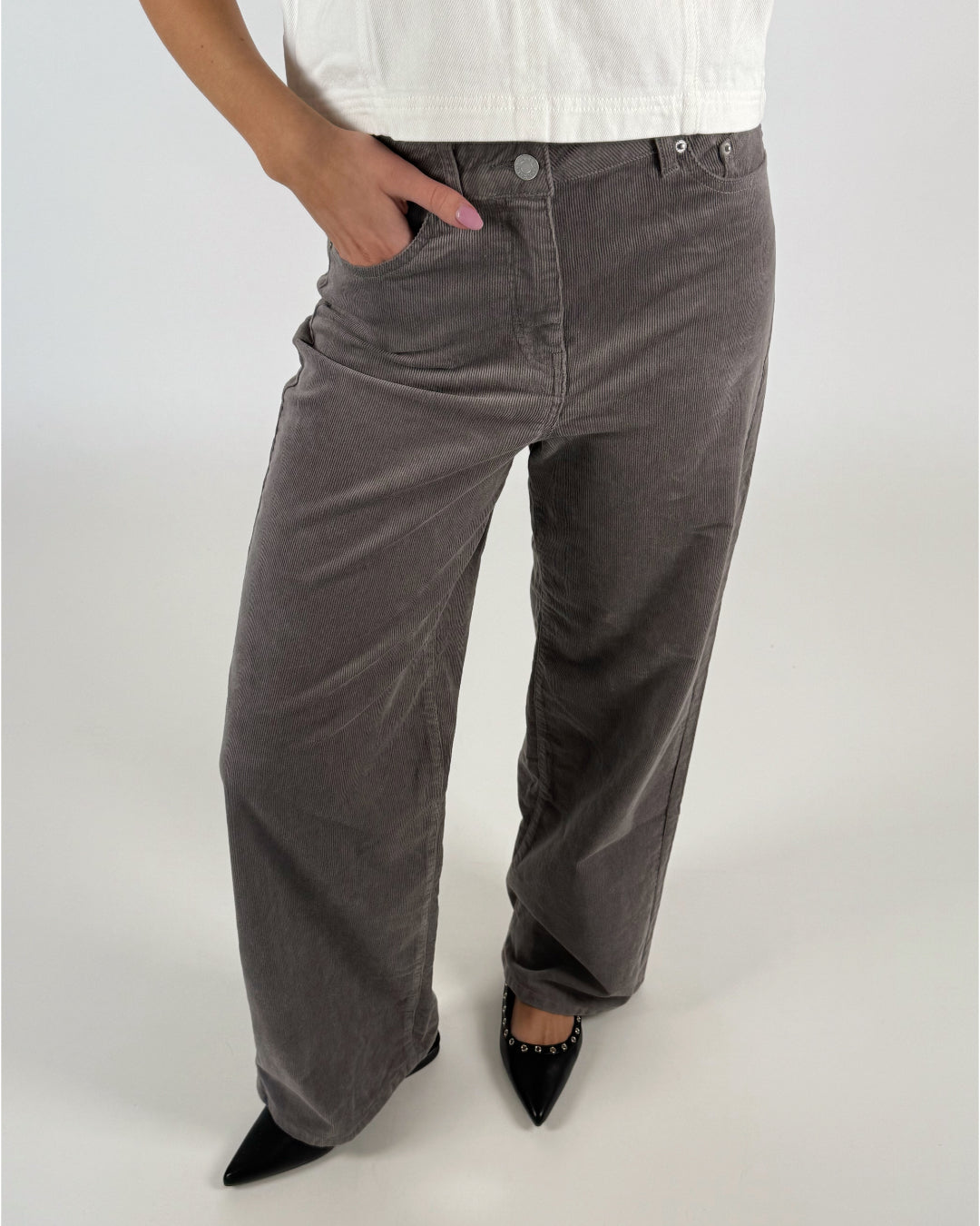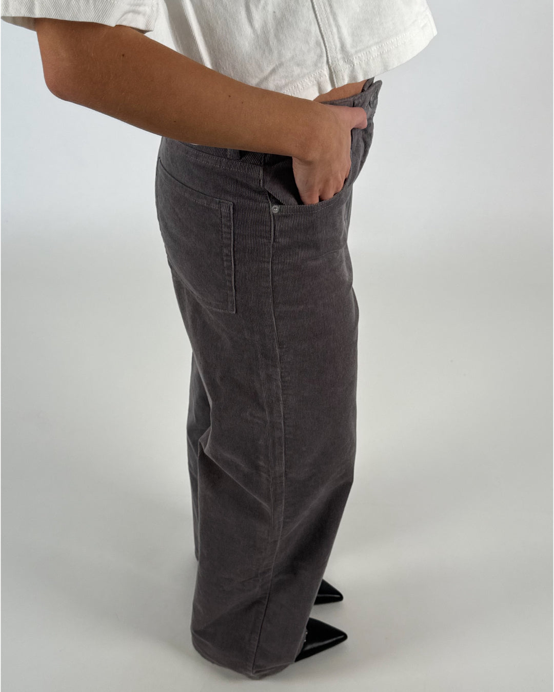 En person iført grå fløjlsbukser med hånden i lommen står på en lys baggrund. De har sorte, spidse sko med dekorative nitter.