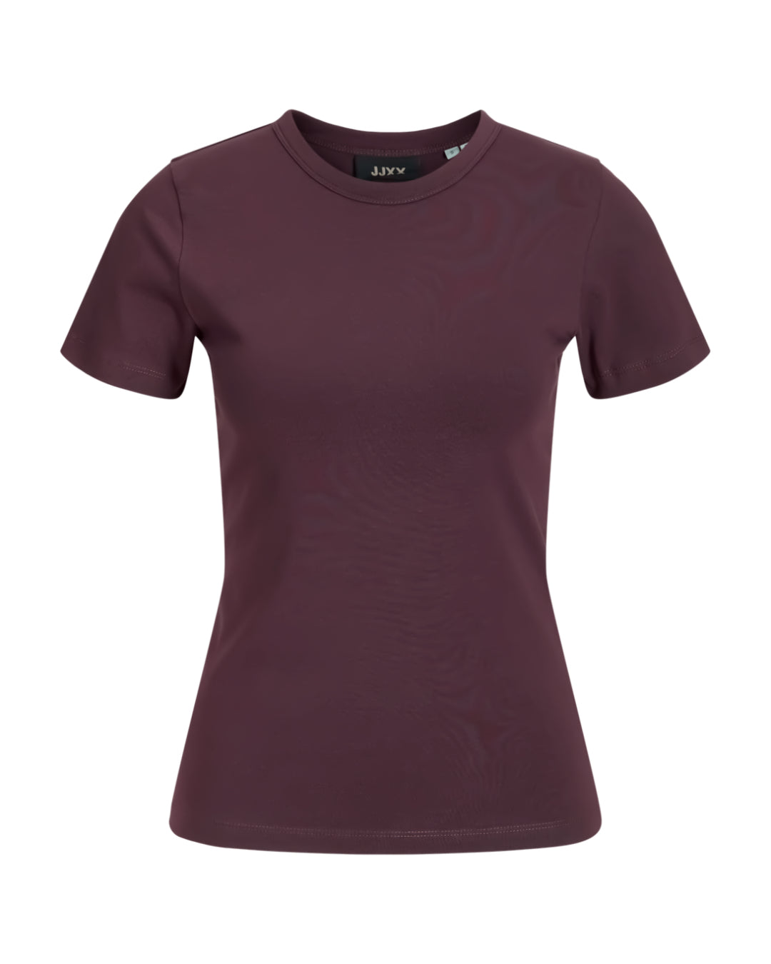 T-shirt i dyb bordeauxfarve uden mønster, præsenteret på en hvid baggrund. Mærket indeni angiver "JJXX".
