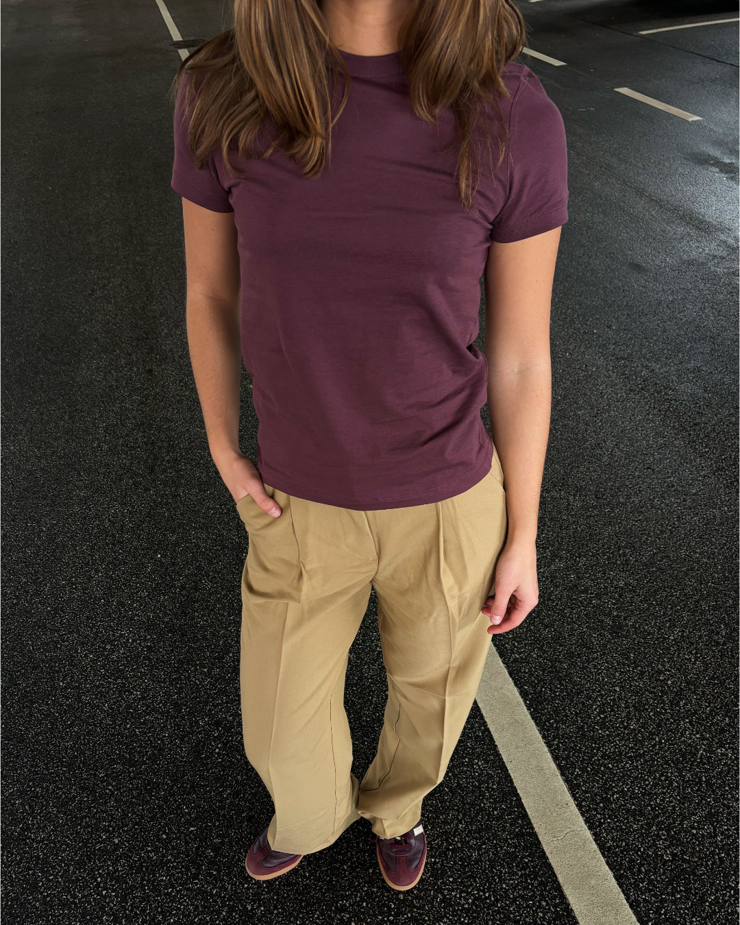 Person står på en sort asfaltvej. De har en lilla t-shirt og beige bukser på. Hånden er i lommen, og de bærer brune sko. Vejen har hvide markeringer.