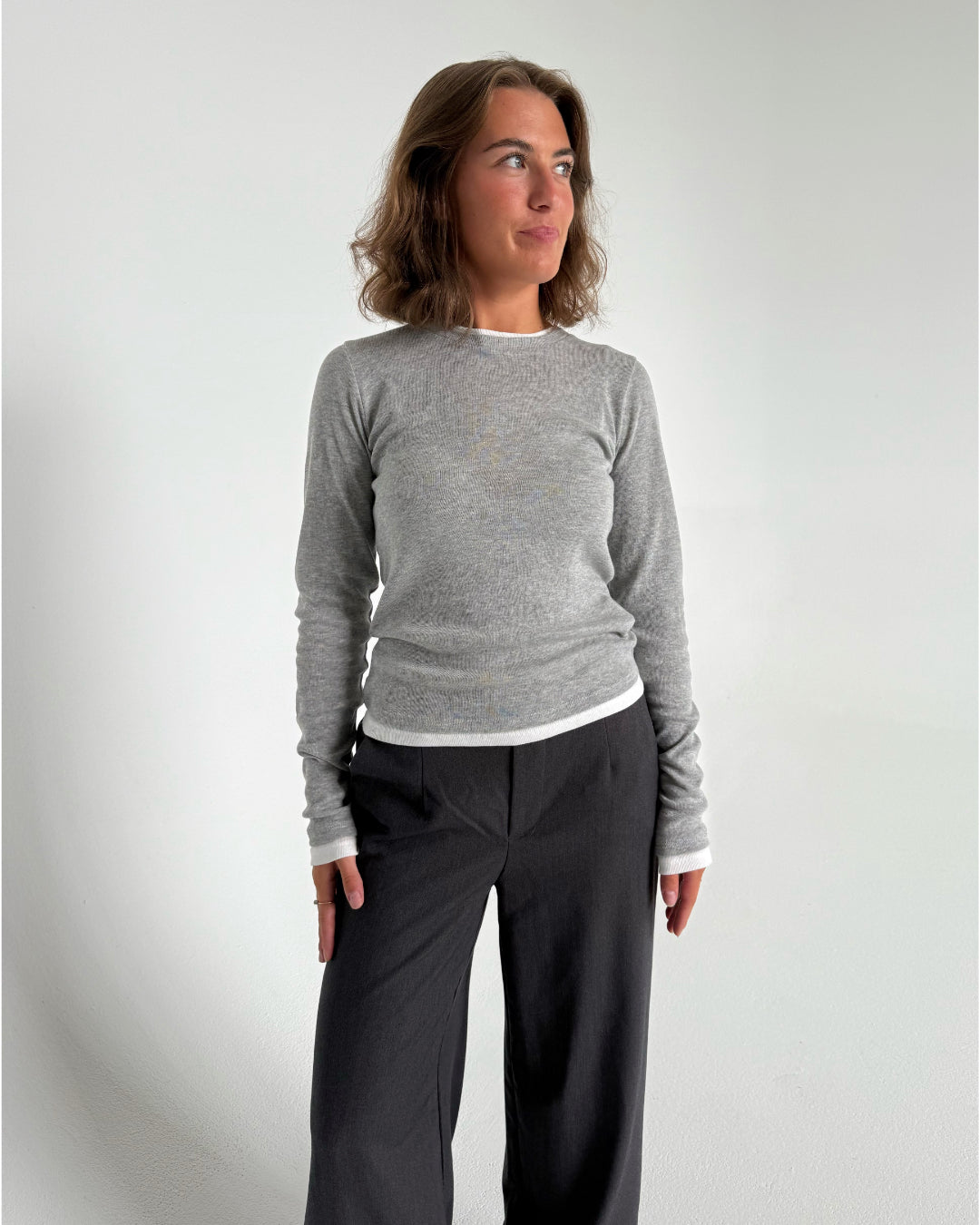 Produktfoto af en Henna bluse i lysgrå med hvid kant. Baggrund er hvid. Fra BySofieSønderby
