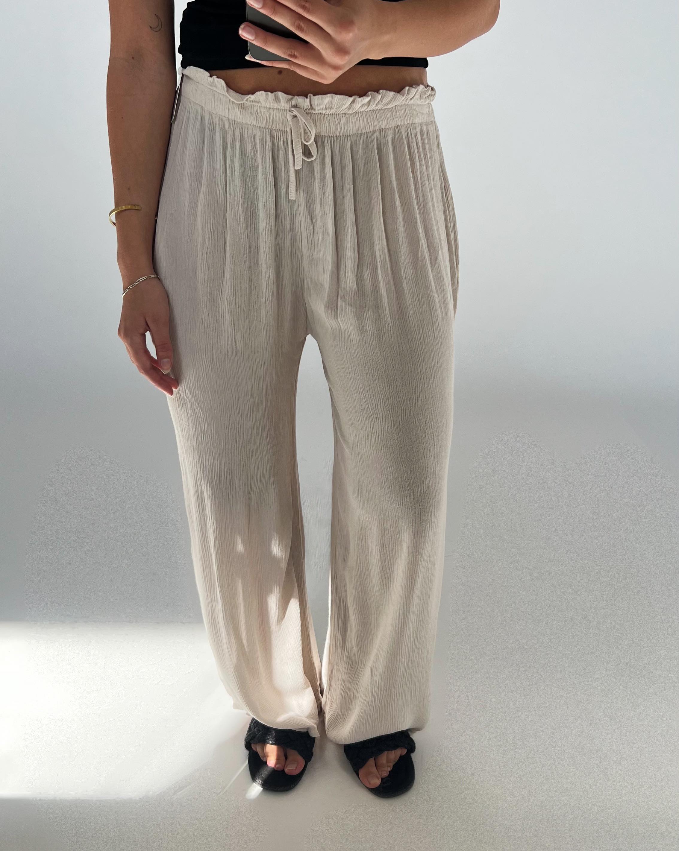 De coola ILIA byxorna, beige är ett par perfekta lösa byxor. Byxorna är lösa och luftiga, och passar perfekt i varje garderob.