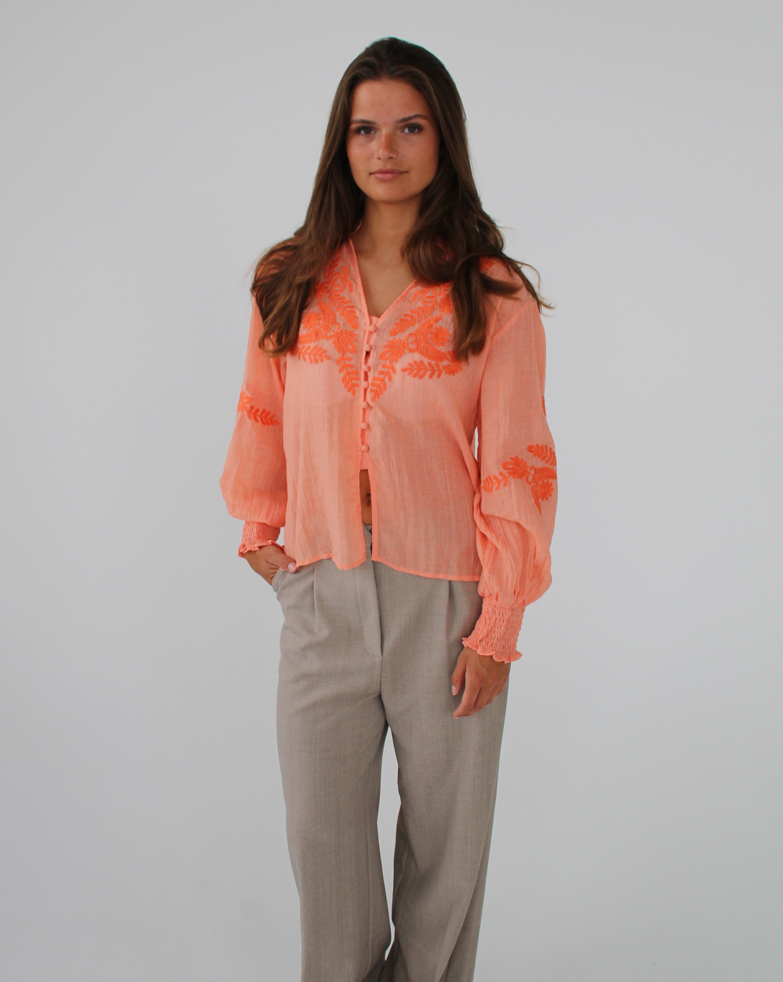 Den vackra ILYA skjorta, coral har vackra blommor detaljer på tyget, och är med vackra ballongärmar. Skjortan passar perfekt i varje garderob.