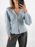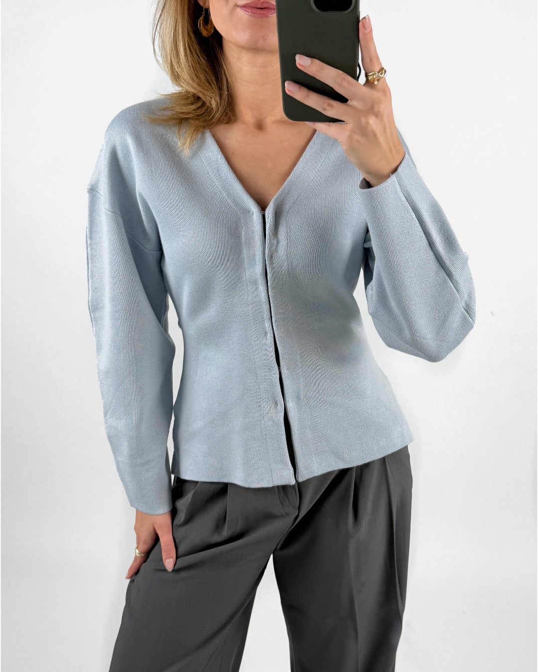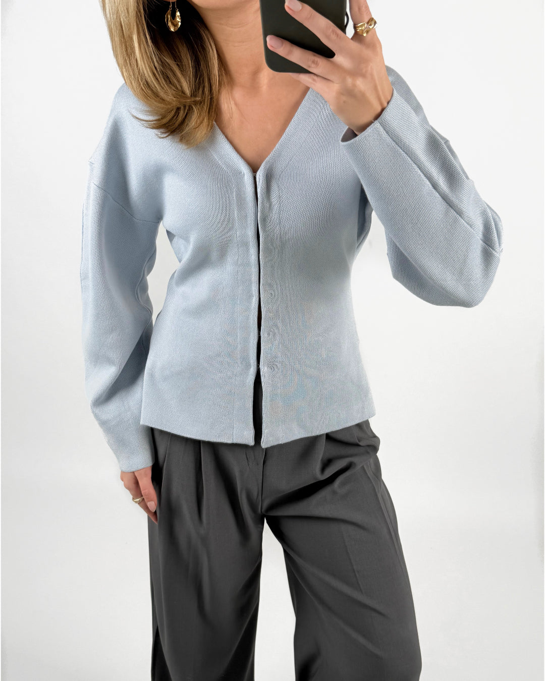 INDY cardigan, ljusblå är en verkligen fin och enkel cardigan med dold stängning fram. Den är mycket simpel och elegant. Den är figursydd och kan användas som en blazer.