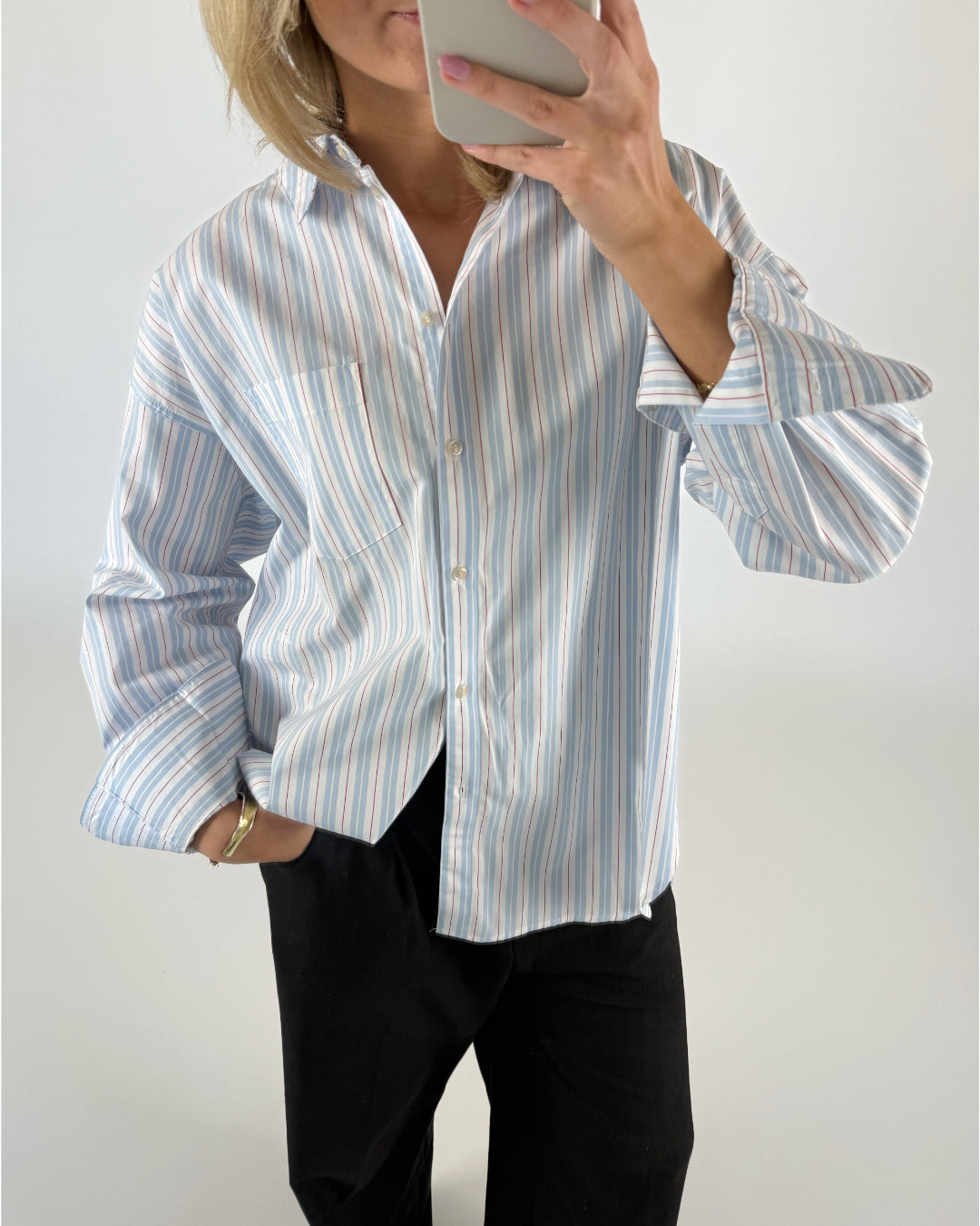 Vår vackra JAMIE skjorta, blå/röd är en klassisk skjorta i den vackra ljusblå och vit randiga färgen, med helt tunna, röda ränder. JAMIE skjorta, blå/röd är ett stilrent plagg som kan användas till många olika tillfällen.