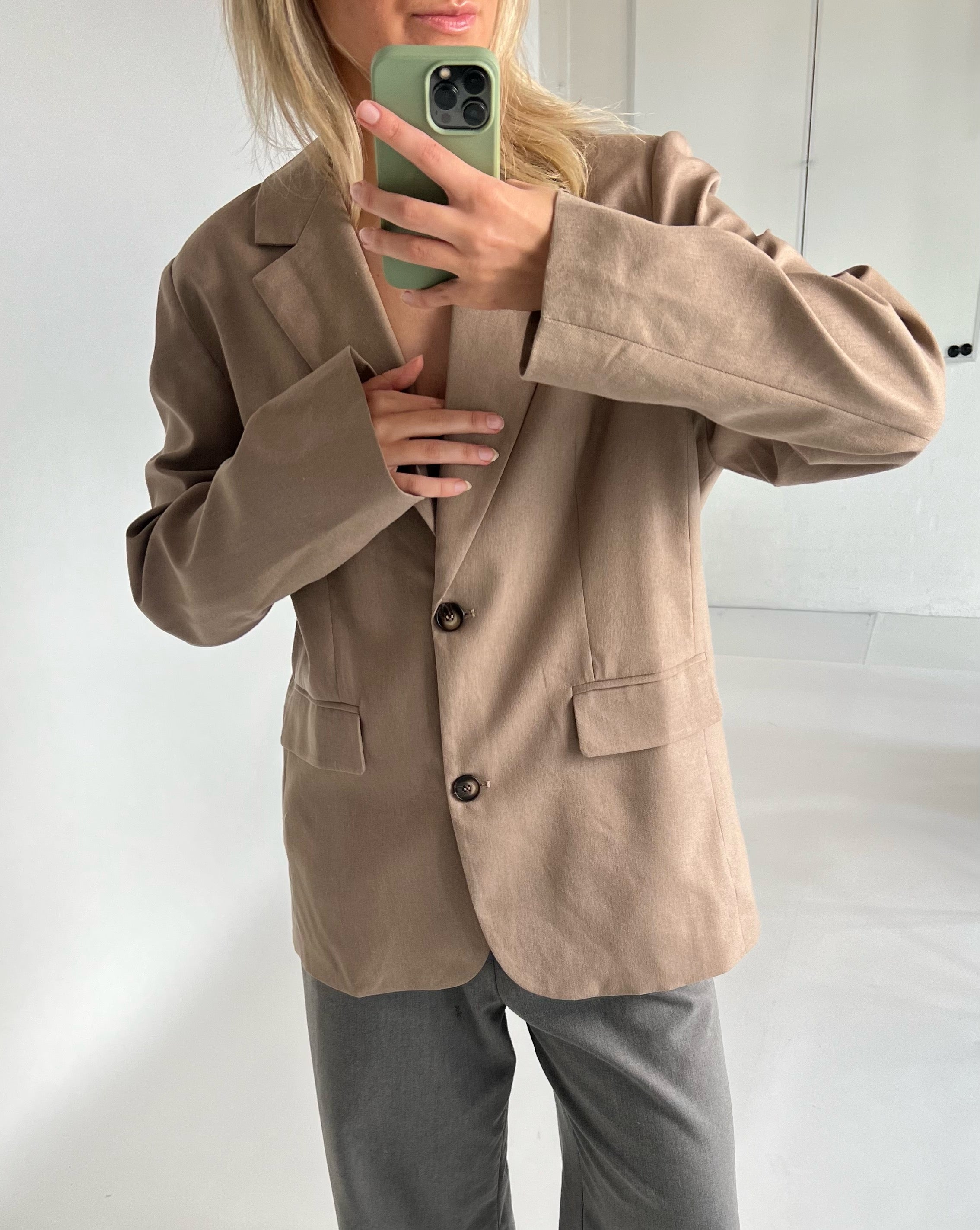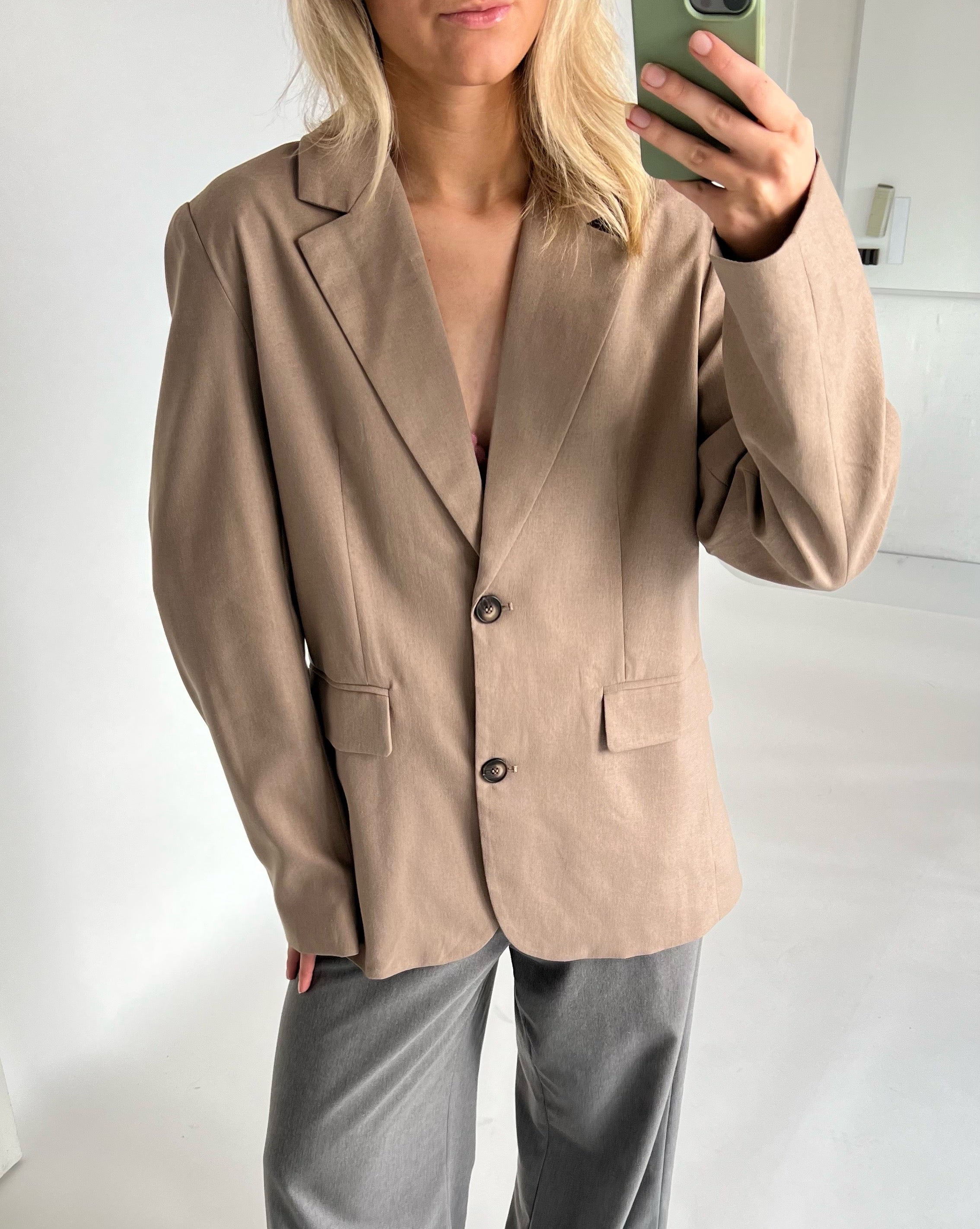 JOHANNE blazer, sand har två knappar fram och kan både bäras öppen och stängd. Ärmarna är normala och har en rak look. Dessutom har blazern små axelvaddar och två fickor.