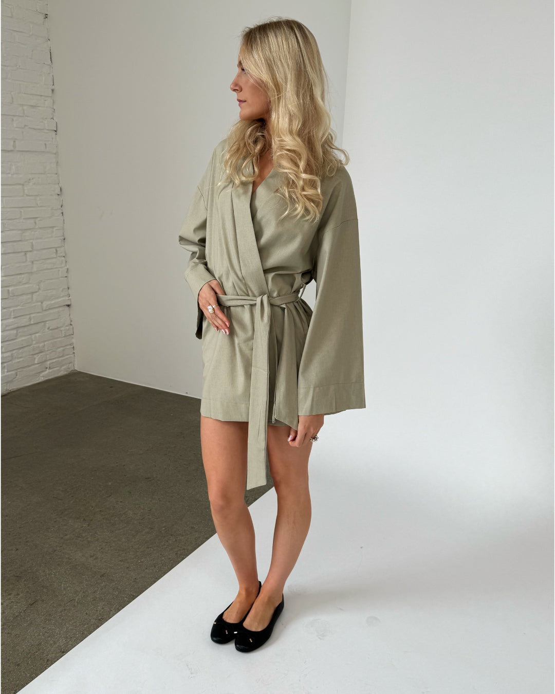 Den fina JUNE klänningen, kaki har nu landat i shoppen. Klänningen har en kimono-look, och är helt enkel i tyget och med bindeband i midjan.