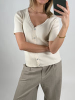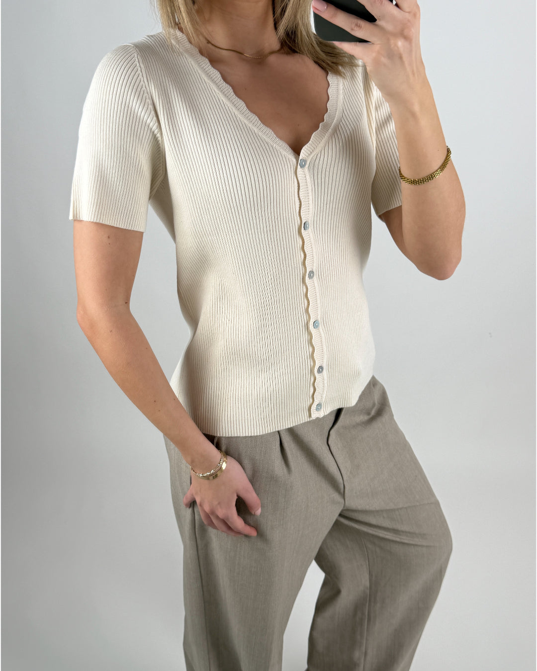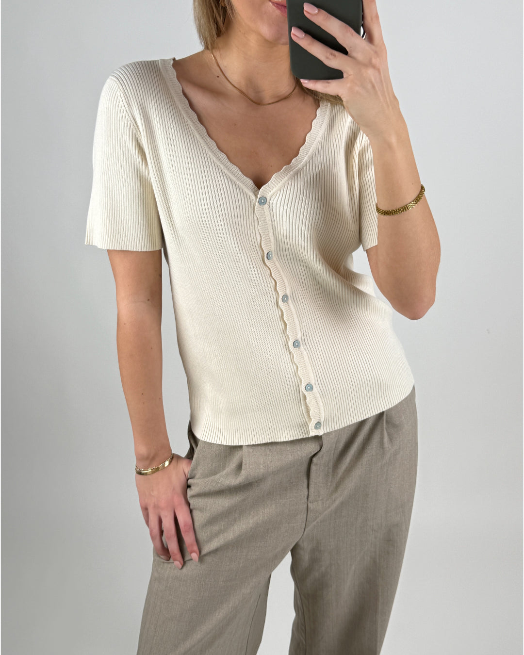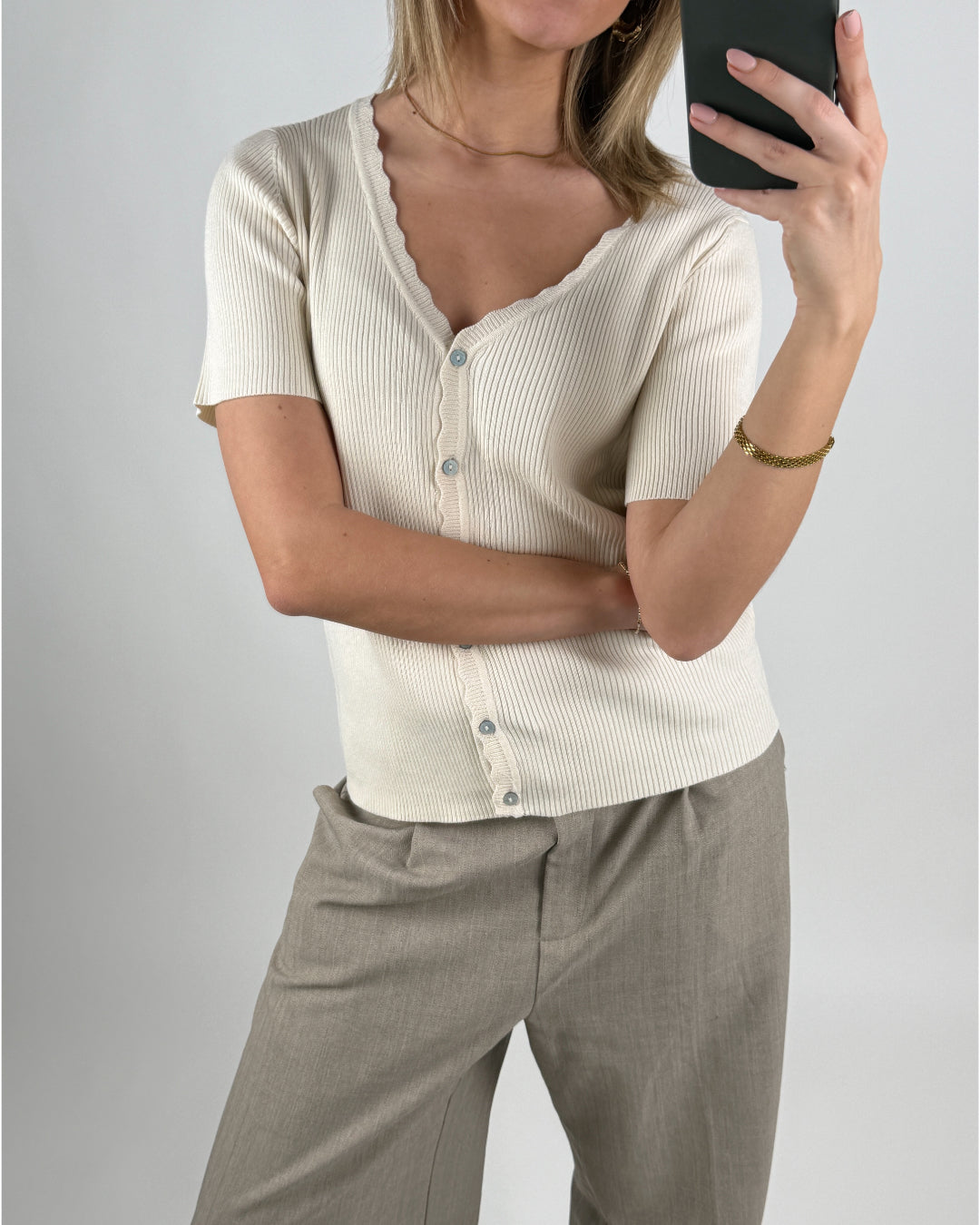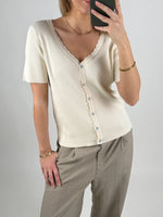 KELLY kortärmad cardigan, beige är det perfekta tillskottet till din sommargarderob. Cardiganen är utformad i en lätt och mjuk ribbstickad kvalitet, som säkerställer hög komfort och ett feminint uttryck. Den fina, ljusa färgen gör den lätt att styla till både ljusa och mörka nyanser, och de små knapparna fram ger en klassisk och tidlös look. En elegant V-urringning och diskreta detaljer vid hals och stängning understryker den enkla, men stiliga designen.