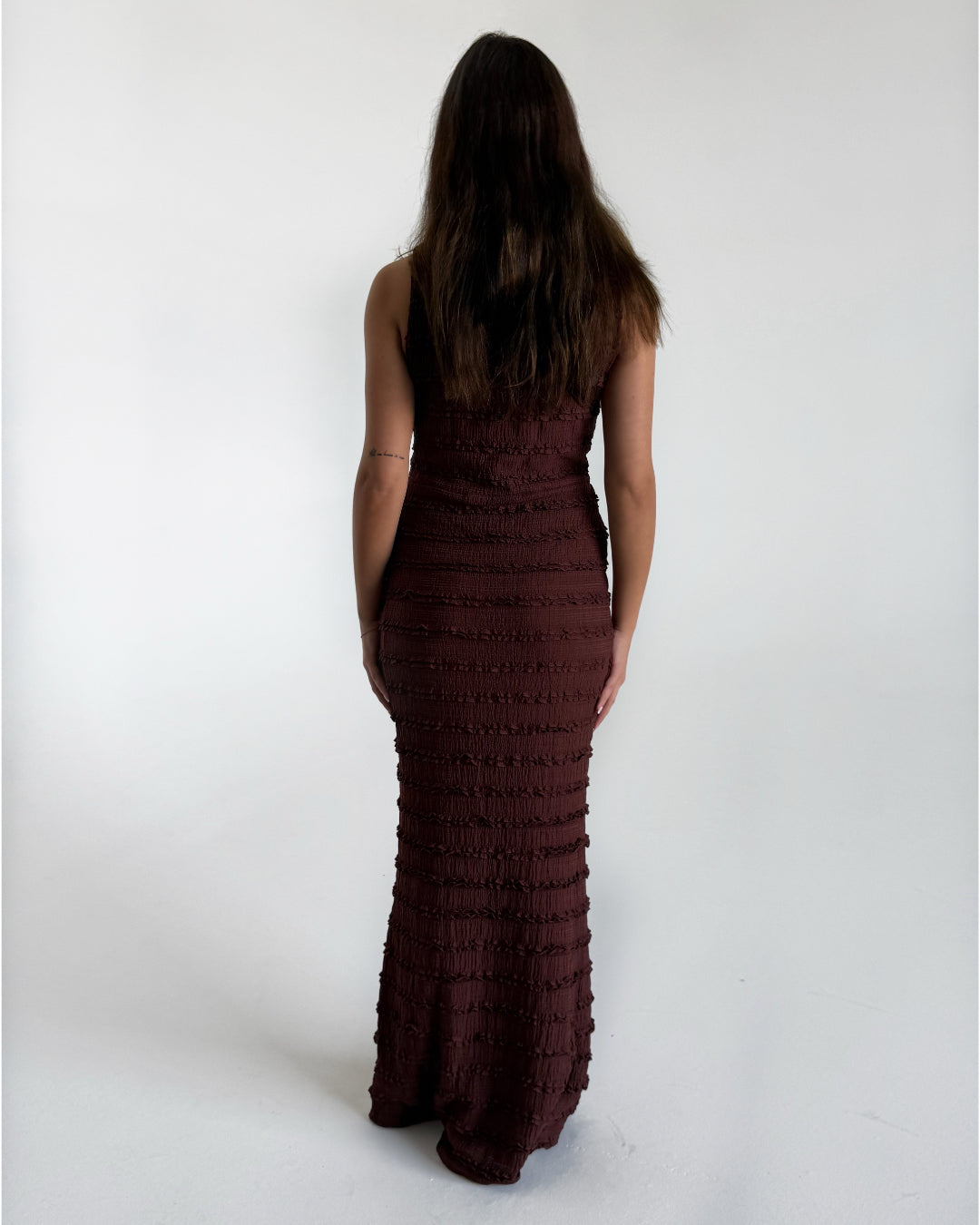 Vår KIMBERLY klänning, brun är en vacker maxiklänning, i en otroligt feminin look.