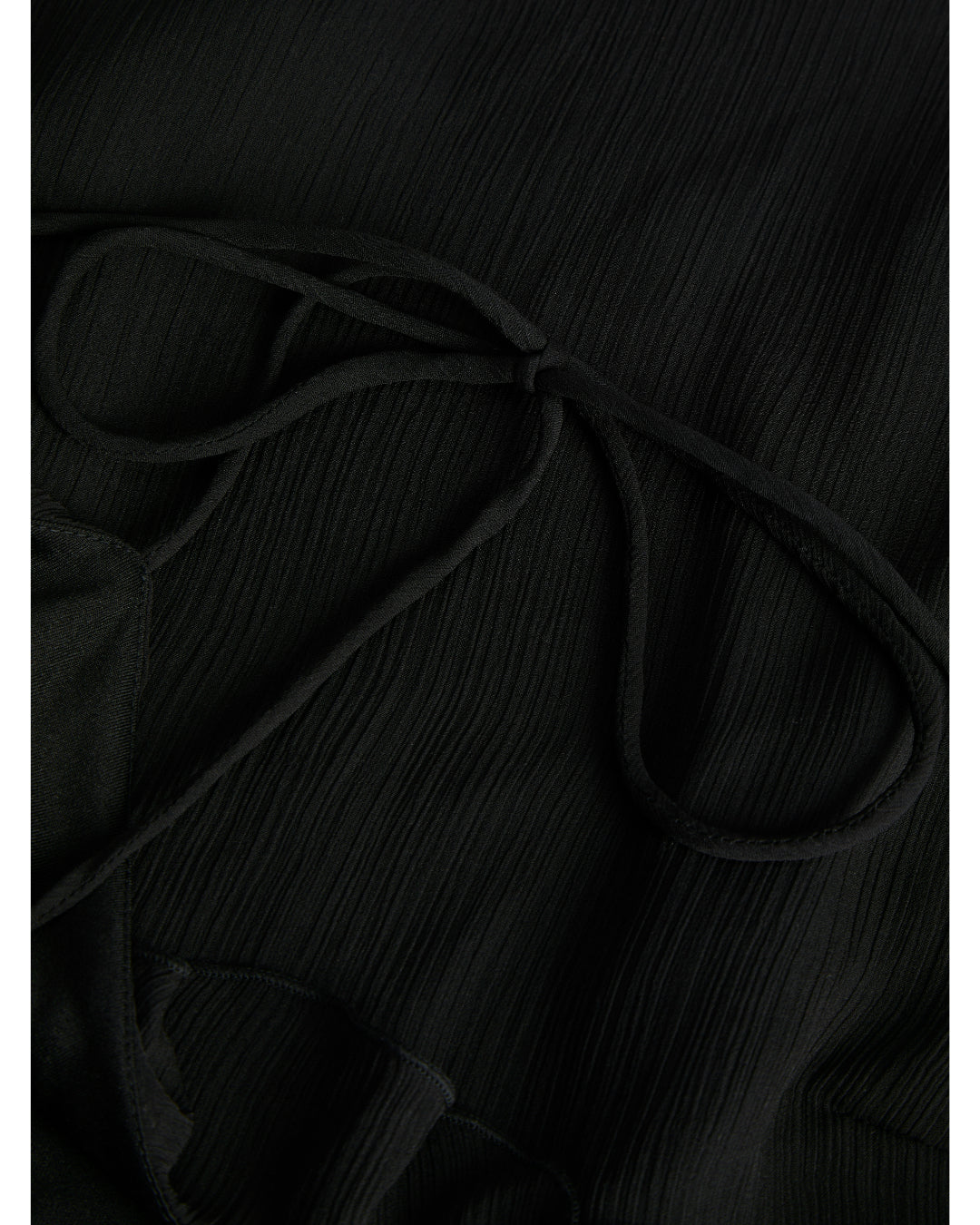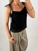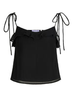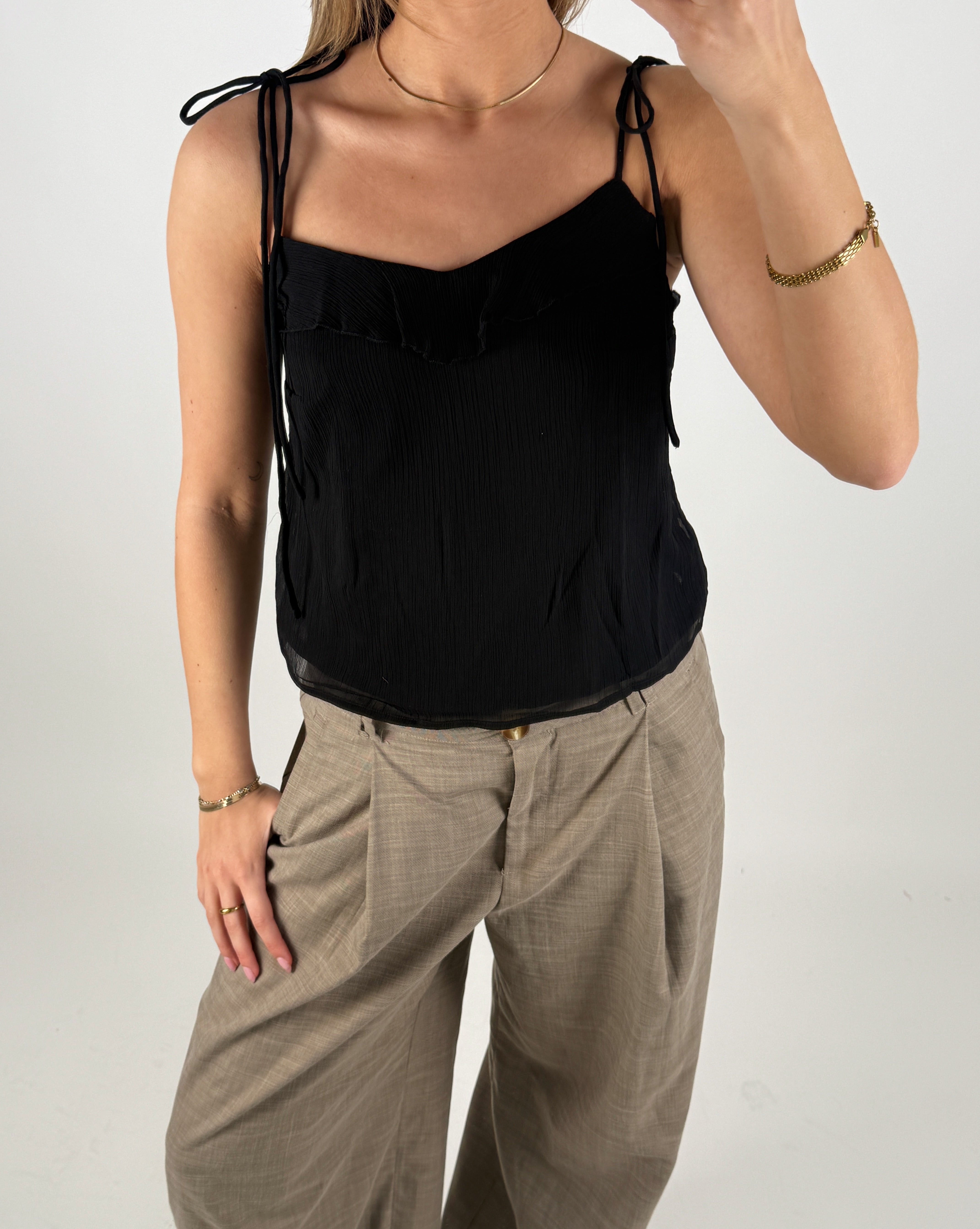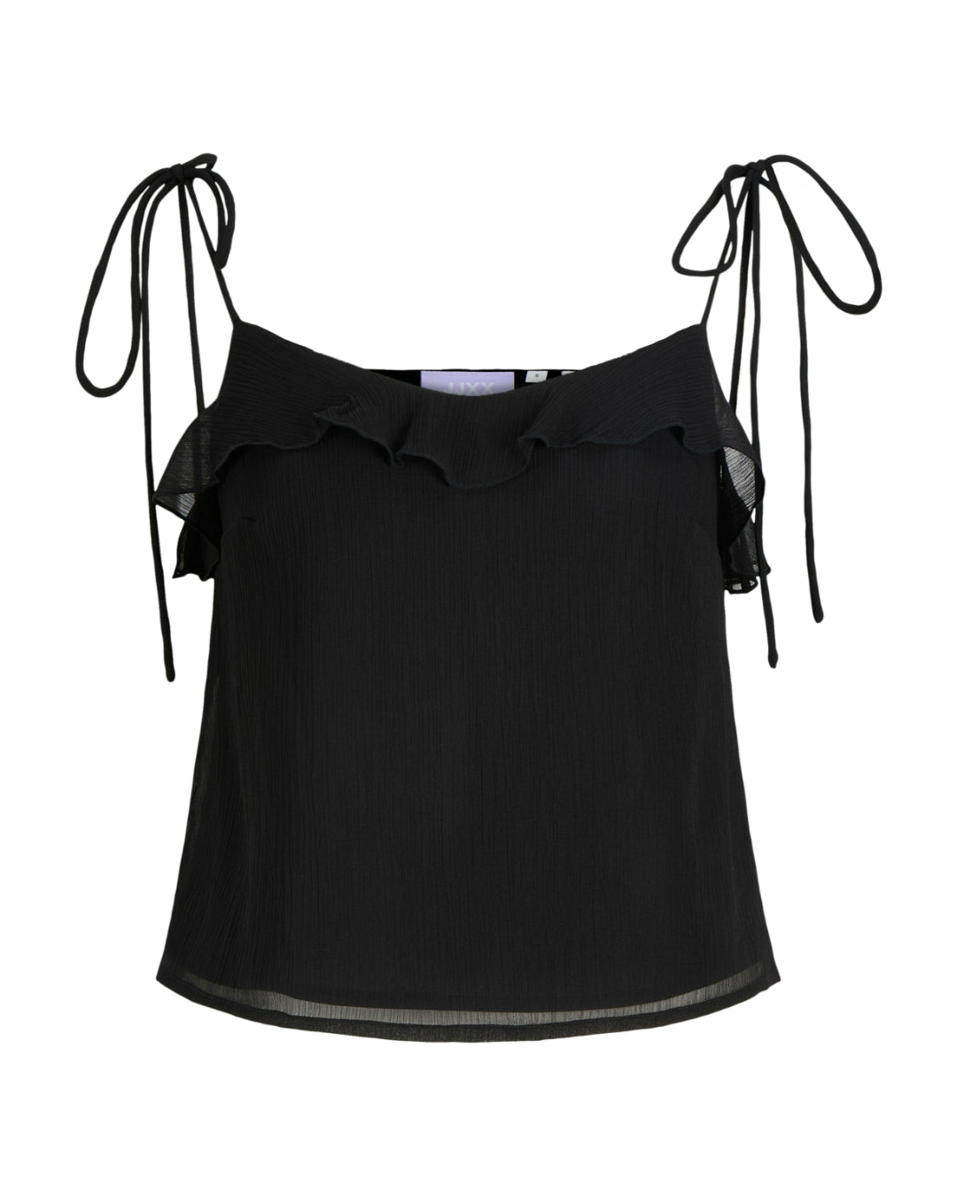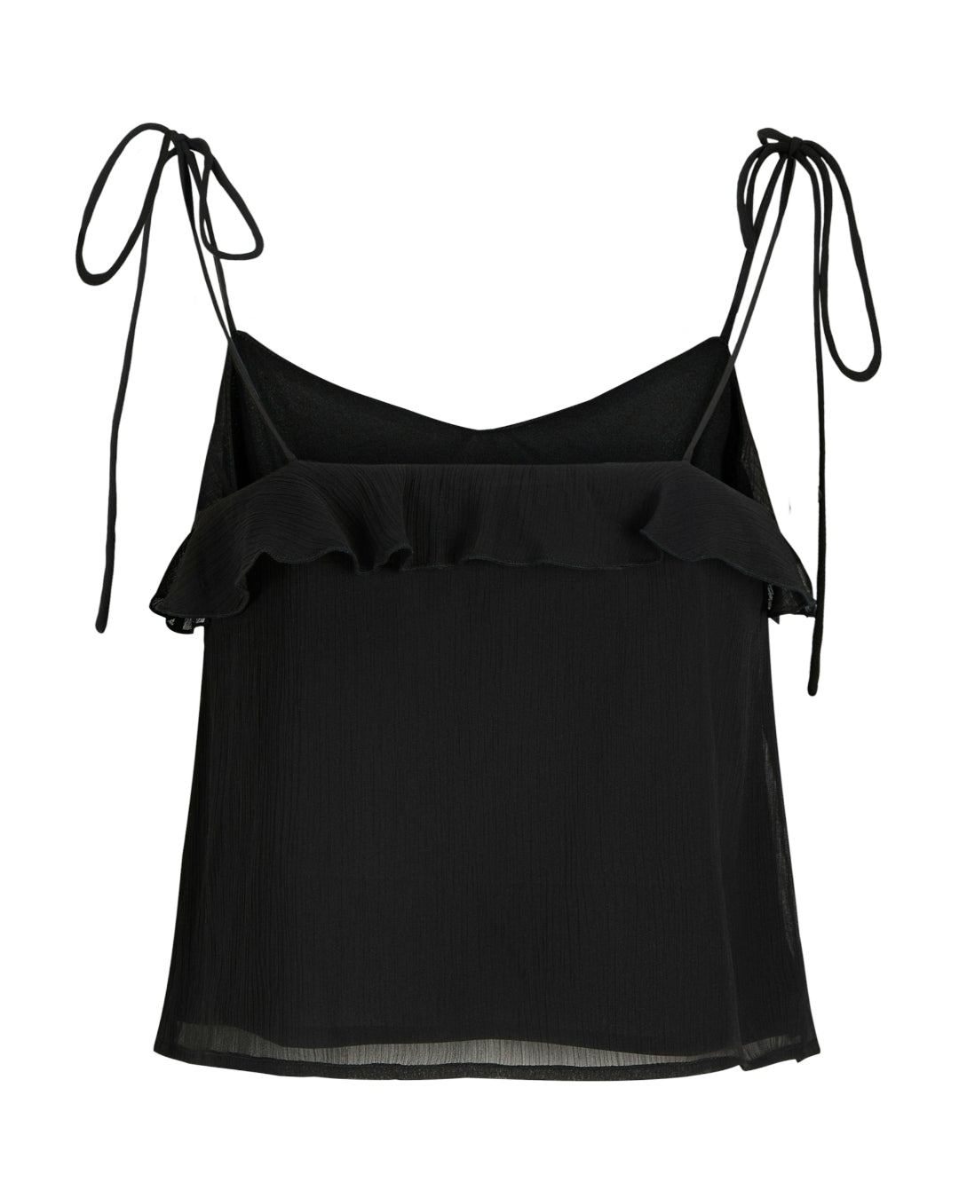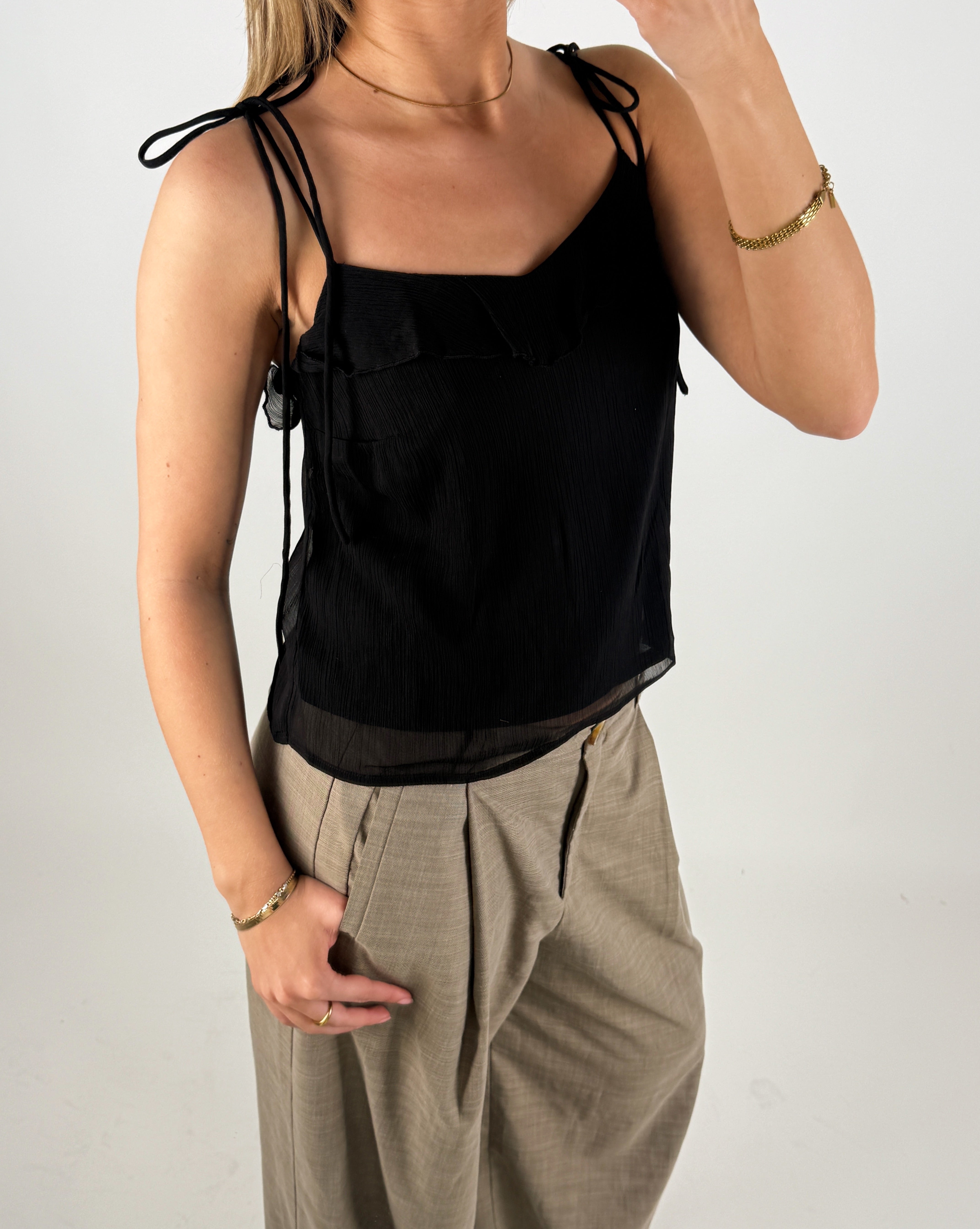 Denna feminina LANA topp, svart är det perfekta valet för sommaren och festliga tillfällen. Toppen är svart och har ett lätt, luftigt material som säkerställer både komfort och ett elegant fall. Den har tunna band som knyts på axlarna, vilket gör det möjligt att justera längd och passform för ett personligt uttryck.