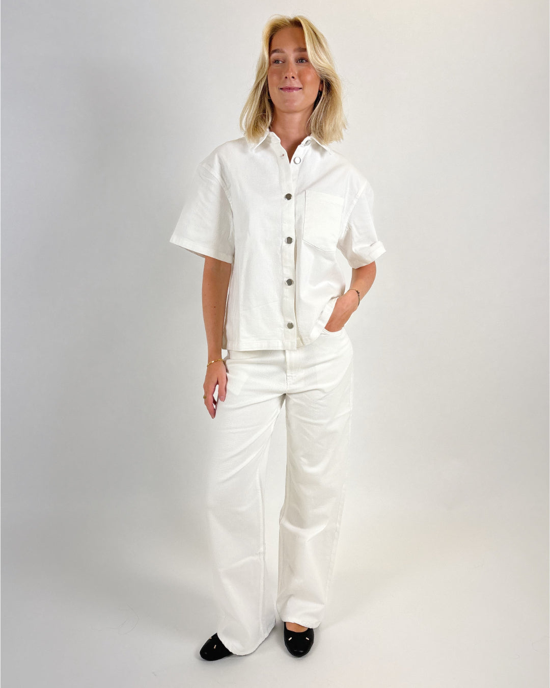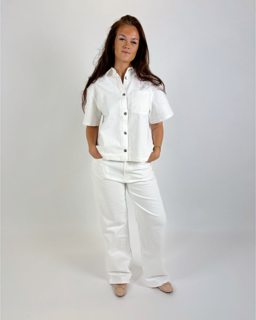 LOUISE denimskjorta, vit har vackra detaljer med blanka knappar, stora ärmar och en boxy passform.