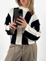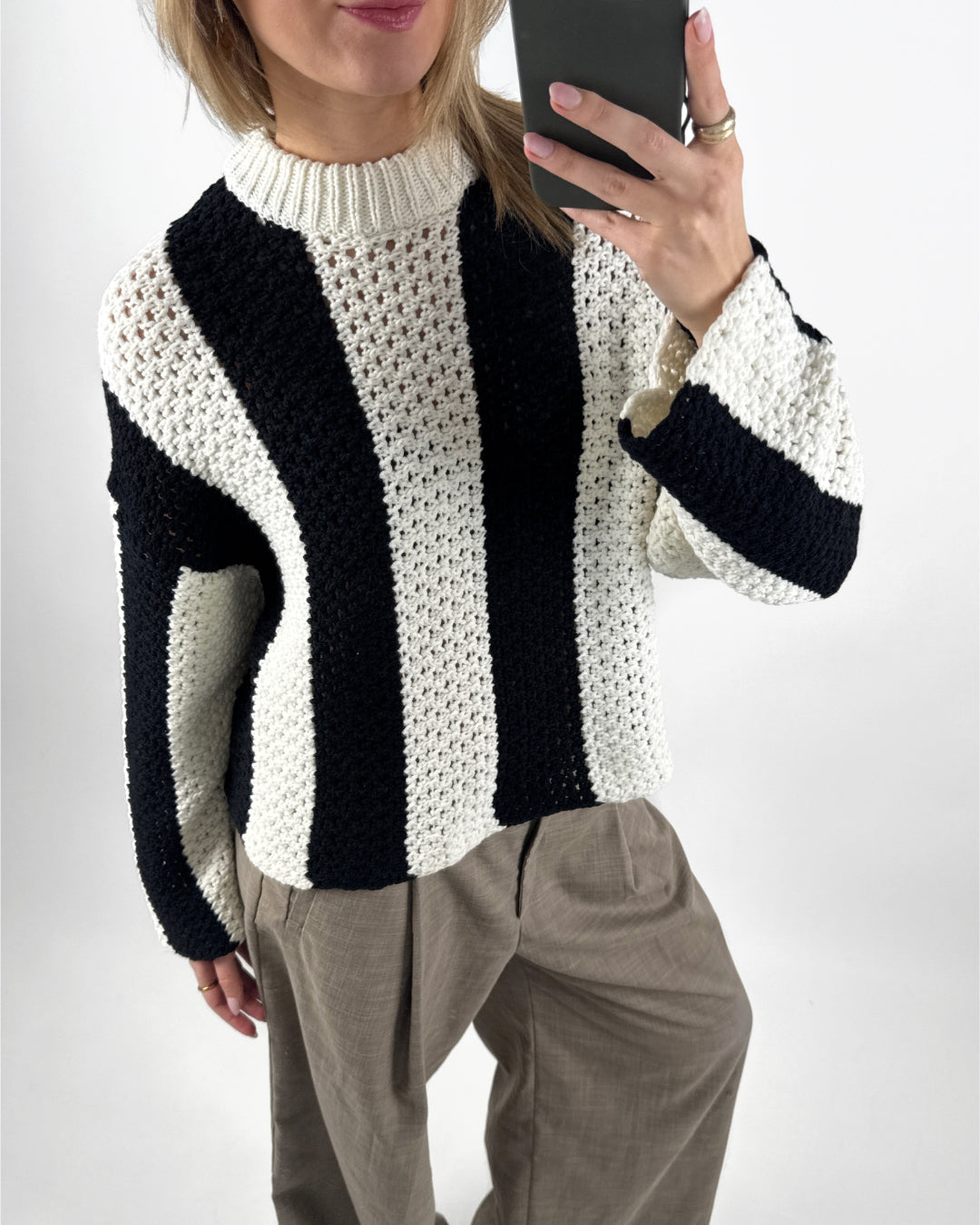 Den vackra MENAKA sticka randig, svart/vit, kombinerar komfort och stil med sin moderna design som känns mjuk och behaglig mot huden. De långa ärmarna och den lösa passformen ger ett avslappnat uttryck, medan de breda ränderna i svart och vitt skapar ett iögonfallande och grafiskt utseende.