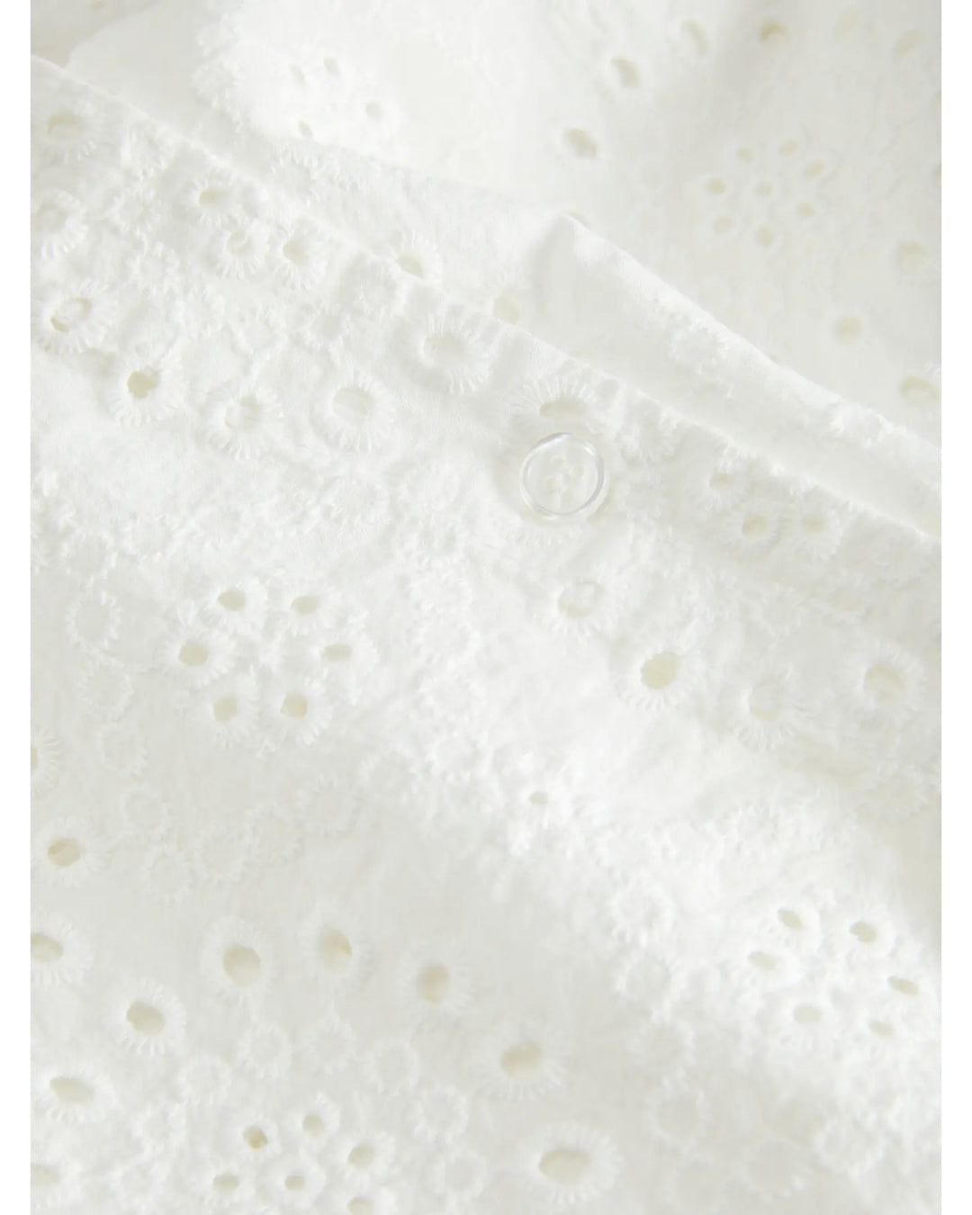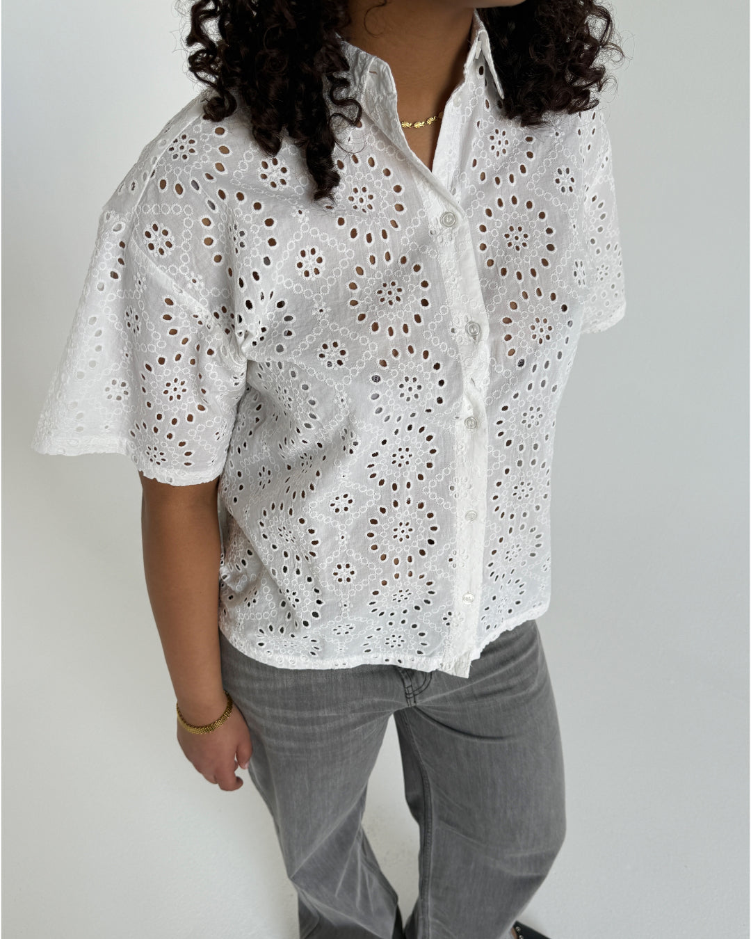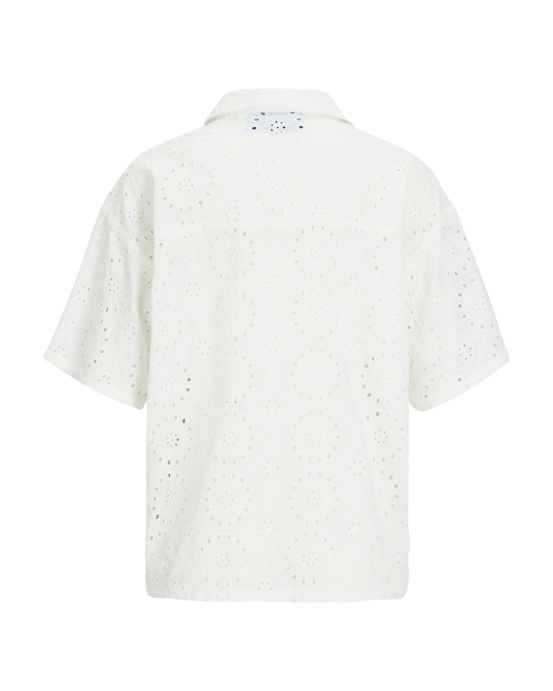 Hvid camisola med korte ærmer og hulmønster. Den har en klassisk krave og knaplukning, hænger frit mod en simpel, hvid baggrund. Etiket med teksten "JJXX" indeni.