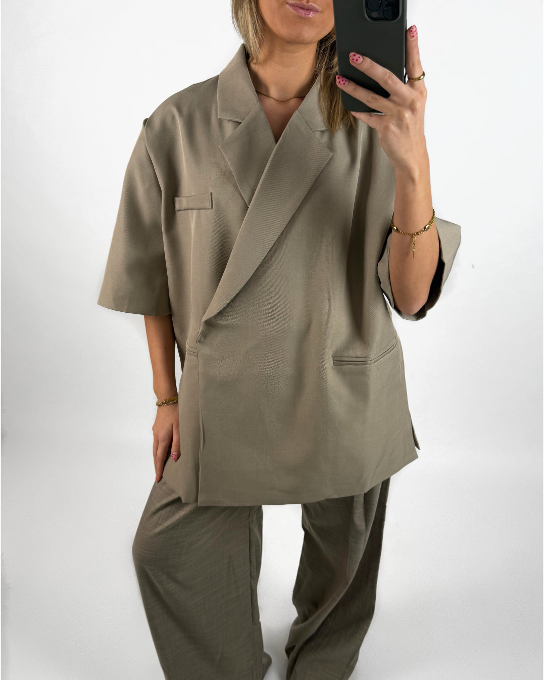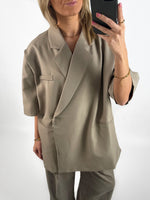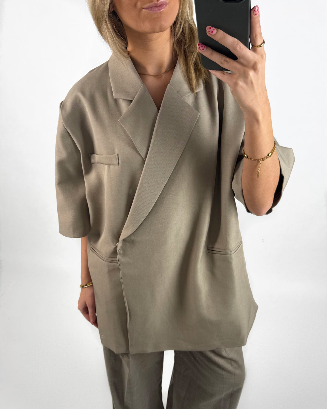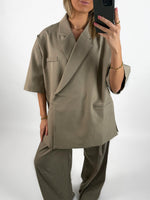 MINNIE oversized kortärmad blazer, beige är den perfekta oversized blazern, gjord ännu mer unik med sina korta t-shirt ärmar. Eftersom blazern är så oversized, ger den nästan motsatt effekt av det maskulina från en blazer, till att den blir feminin, på grund av passformen.
