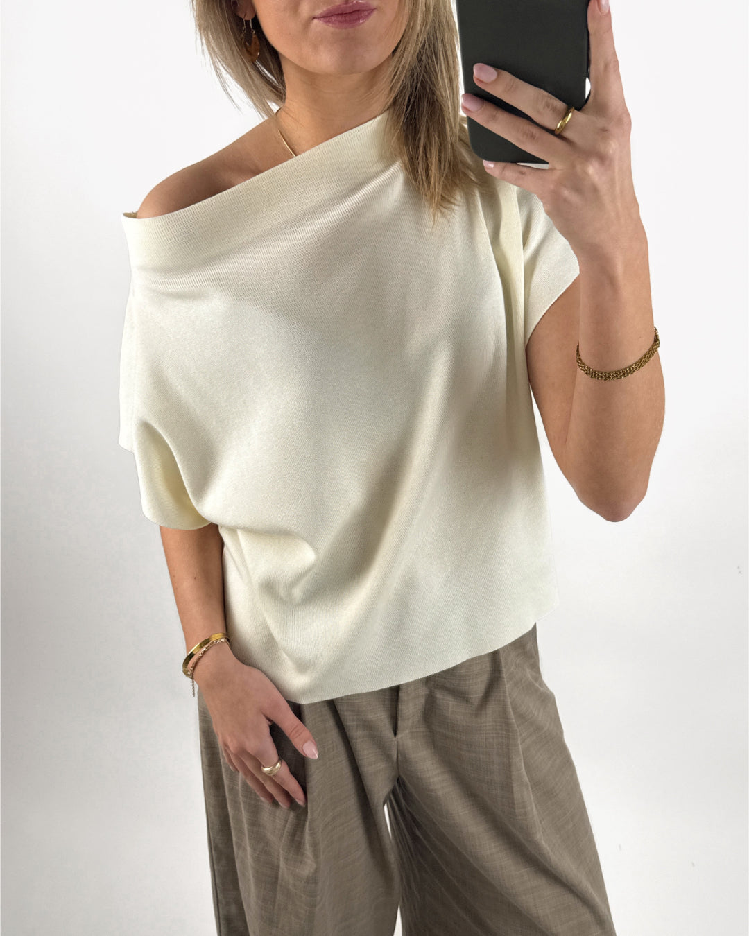MONA one shoulder top, creme kan bäras som one shoulder top, men kan också bäras helt rak, där toppen får ett fint uttryck med båthals.