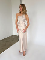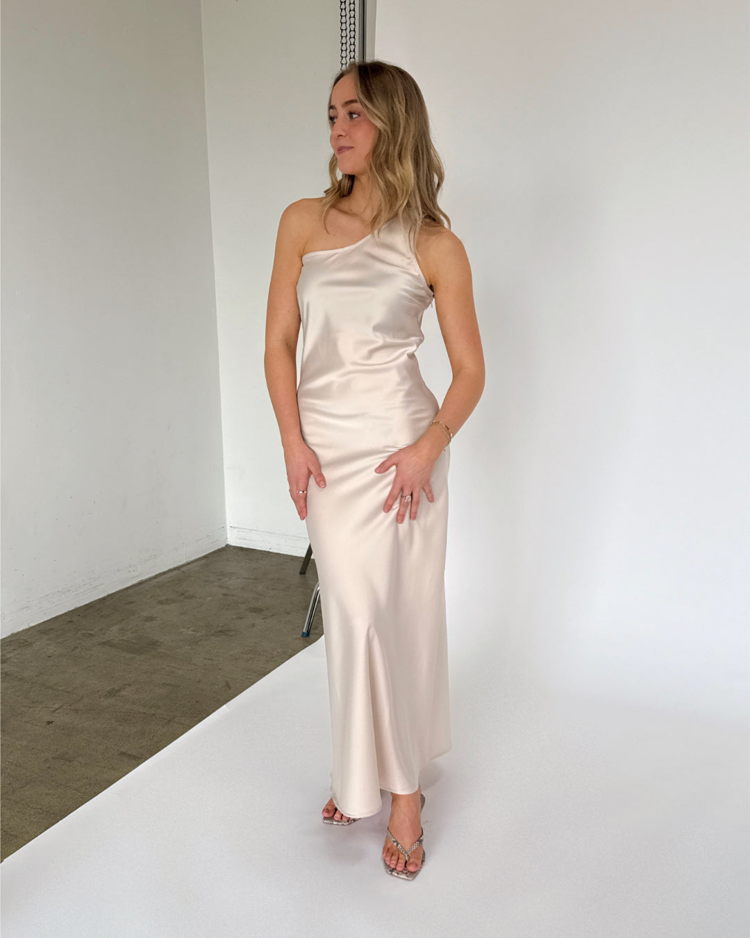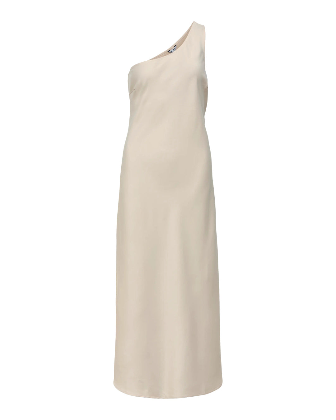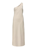 Denna eleganta och stilrena NAT one shoulder klänning, beige är det självklara valet för både festliga tillfällen och sommarkvällar. Klänningen har en modern, asymmetrisk skärning med one shoulder, som ger ett elegant och feminint uttryck. Den långa, figursydda silhuetten faller vackert längs kroppen och säkerställer en vacker passform. Materialet är lätt och bekvämt, vilket gör klänningen komfortabel att bära både dag och kväll.