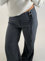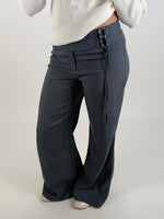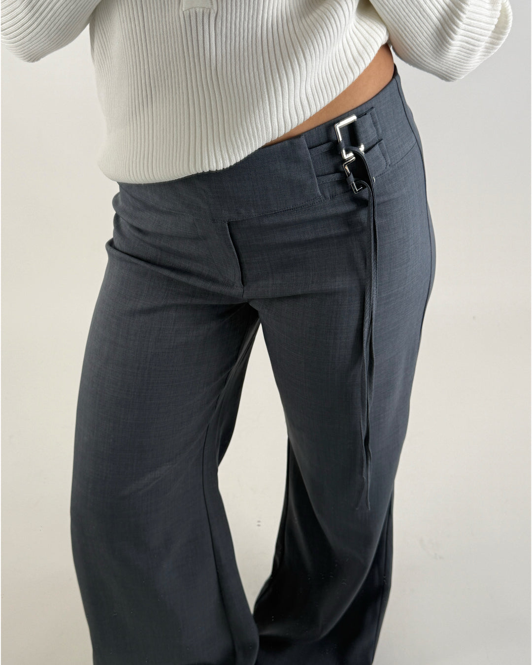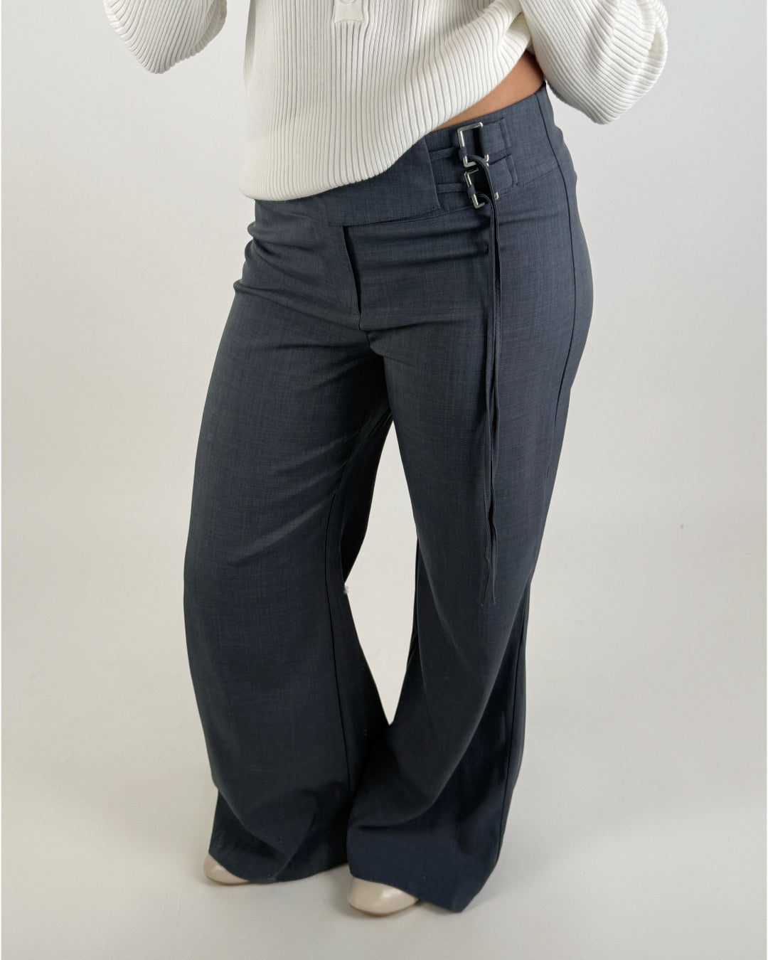 Stiliga och moderna NATALY byxor, grå med vida ben. Byxorna har en hög midja och stängs med dragkedja. Vid höften på ena sidan har byxan två dekorativa metallspännen, där en lång snodd dras igenom, vilket ger möjlighet att knyta en fin detalj eller justera passformen i midjan.